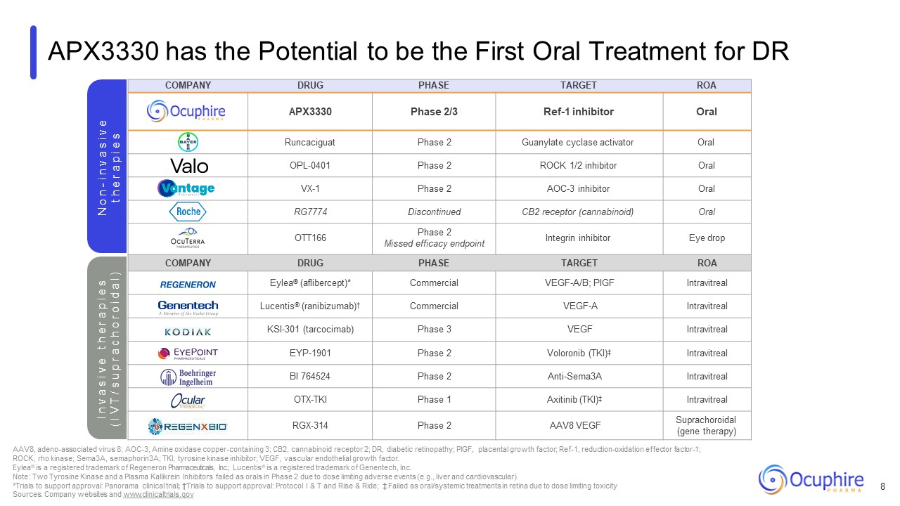 COMPANY  DRUG  PHASE  TARGET  ROA  APX3330  Phase 2/3  Ref-1 inhibitor  Oral  Runcaciguat  Phase 2  Guanylate cyclase activator  Oral  OPL-0401  Phase 2  ROCK 1/2 inhibitor  Oral  VX-1  Phase 2  AOC-3 inhibitor  Oral  RG7774  Discontinued  CB2 receptor (cannabinoid)  Oral  OTT166  Phase 2  Missed efficacy endpoint  Integrin inhibitor  Eye drop  COMPANY  DRUG  PHASE  TARGET  ROA  Eylea® (aflibercept)*  Commercial  VEGF-A/B; PIGF  Intravitreal  Lucentis® (ranibizumab)†  Commercial  VEGF-A  Intravitreal  KSI-301 (tarcocimab)  Phase 3  VEGF  Intravitreal  EYP-1901  Phase 2  Voloronib (TKI)‡  Intravitreal  BI 764524  Phase 2  Anti-Sema3A  Intravitreal  OTX-TKI  Phase 1  Axitinib (TKI)‡  Intravitreal  RGX-314  Phase 2  AAV8 VEGF  Suprachoroidal  (gene therapy)  APX3330 has the Potential to be the First Oral Treatment for DR  N o n - i n v a s i v e t h e r a p i e s  AAV8, adeno-associated virus 8; AOC-3, Amine oxidase copper-containing 3; CB2, cannabinoid receptor 2; DR, diabetic retinopathy; PIGF, placental growth factor; Ref-1, reduction-oxidation effector factor-1; ROCK, rho kinase; Sema3A, semaphorin3A; TKI, tyrosine kinase inhibitor; VEGF, vascular endothelial growth factor.  Eylea® is a registered trademark of Regeneron Pharmaceuticals, Inc.; Lucentis® is a registered trademark of Genentech, Inc.  Note: Two Tyrosine Kinase and a Plasma Kallikrein Inhibitors failed as orals in Phase 2 due to dose limiting adverse events (e.g., liver and cardiovascular).  *Trials to support approval: Panorama clinical trial; †Trials to support approval: Protocol I & T and Rise & Ride; ‡ Failed as oral/systemic treatments in retina due to dose limiting toxicity Sources: Company websites and www.clinicaltrials.gov  I n v a s i v e t h e r a p i e s  ( I V T / s u p r a c h o r o i d a l )  8