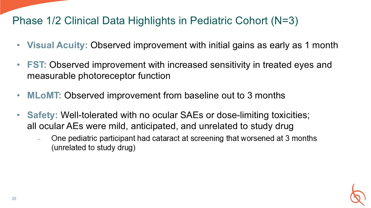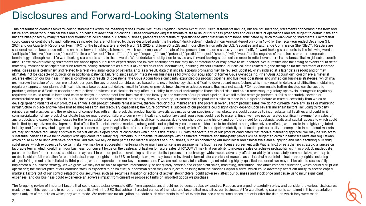 This presentation contains forward-looking statements within the meaning of the Private Securities Litigation Reform Act of 1995. Such statements include, but are not limited to, statements concerning data from and future enrollment for our clinical trials and our pipeline of additional indications. These forward-looking statements relate to us, our business prospects and our results of operations and are subject to certain risks and uncertainties posed by many factors and events that could cause our actual business, prospects and results of operations to differ materially from those anticipated by such forward-looking statements. Factors that could cause or contribute to such differences include, but are not limited to, those described under the heading “Risk Factors” included in our Annual Report on Form 10-K for the fiscal year ended December 31, 2024 and our Quarterly Reports on Form 10-Q for the fiscal quarters ended March 31, 2025 and June 30, 2025 and in our other filings with the U.S. Securities and Exchange Commission (the “SEC”). Readers are cautioned not to place undue reliance on these forward-looking statements, which speak only as of the date of this presentation. In some cases, you can identify forward-looking statements by the following words: “anticipate,” “believe,” “continue,” “could,” “estimate,” “expect,” “intend,” “aim,” “may,” “ongoing,” “plan,” “potential,” “predict,” “project,” “should,” “will,” “would” or the negative of these terms or other comparable terminology, although not all forward-looking statements contain these words. We undertake no obligation to revise any forward-looking statements in order to reflect events or circumstances that might subsequently arise. These forward-looking statements are based upon our current expectations and involve assumptions that may never materialize or may prove to be incorrect. Actual results and the timing of events could differ materially from those anticipated in such forward-looking statements as a result of various risks and uncertainties, including, without limitation: our clinical data related to gene therapies for the treatment of inherited retinal diseases is preliminary and related to a relatively small group of patients, and, as a result, data that initially appears promising may be revised, updated, or invalidated at a later data readout and/or may ultimately not be capable of duplication in additional patients; failure to successfully integrate our businesses following our acquisition of former Opus Genetics Inc. (the “Opus Acquisition”) could have a material adverse effect on our business, financial condition and results of operations; the Opus Acquisition significantly expanded our product pipeline and business operations and shifted our business strategies, which may not improve the value of our common stock; our gene therapy product candidates are based on a novel technology that is difficult to develop and manufacture, which may result in delays and difficulties in obtaining regulatory approval; our planned clinical trials may face substantial delays, result in failure, or provide inconclusive or adverse results that may not satisfy FDA requirements to further develop our therapeutic products; delays or difficulties associated with patient enrollment in clinical trials may affect our ability to conduct and complete those clinical trials and obtain necessary regulatory approvals; changes in regulatory requirements could result in increased costs or delays in development timelines; we depend heavily on the success of our product pipeline; if we fail to find strategic partners or fail to adequately develop or commercialize our pipeline products, our business will be materially harmed; others may discover, develop, or commercialize products similar to those in our pipeline before or more successfully than we do or develop generic variants of our products even while our product patents remain active, thereby reducing our market share and potential revenue from product sales; we do not currently have any sales or marketing infrastructure in place and we have limited drug research and discovery capabilities; the future commercial success of our products could significantly depend upon several uncertain factors, including third-party reimbursement practices and the existence of competitors with similar products; product liability lawsuits against us or our suppliers or manufacturers could cause us to incur substantial liabilities and could limit commercialization of any product candidate that we may develop; failure to comply with health and safety laws and regulations could lead to material fines; we have not generated significant revenue from sales of any products and expect to incur losses for the foreseeable future; our future viability is difficult to assess due to our short operating history and our future need for substantial additional capital, access to which could be limited by any adverse developments that affect the financial services markets; raising additional capital may cause our stockholders to be diluted, among other adverse effects; we operate in a highly regulated industry and face many challenges adapting to sudden changes in legislative reform or the regulatory environment, which affects our pipeline stability and could impair our ability to compete in international markets; we may not receive regulatory approval to market our developed product candidates within or outside of the U.S.; with respect to any of our product candidates that receive marketing approval, we may be subject to substantial penalties if we fail to comply with applicable regulatory requirements; our potential relationships with healthcare providers and third-party payors will be subject to certain healthcare laws and regulations, which could expose us to extensive potential liabilities; we rely on third parties for material aspects of our 
