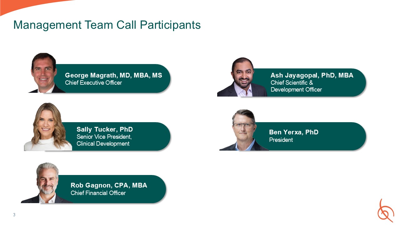 Management Team Call Participants  George Magrath, MD, MBA, MS  Chief Executive Officer  Ben Yerxa, PhD   President  Ash Jayagopal, PhD, MBA  Chief Scientific & Development Officer  Sally Tucker, PhD  Senior Vice President, Clinical Development  3  Rob Gagnon, CPA, MBA  Chief Financial Officer