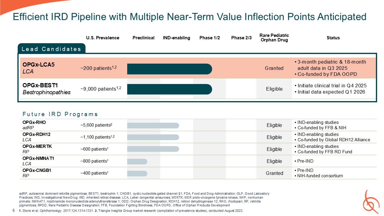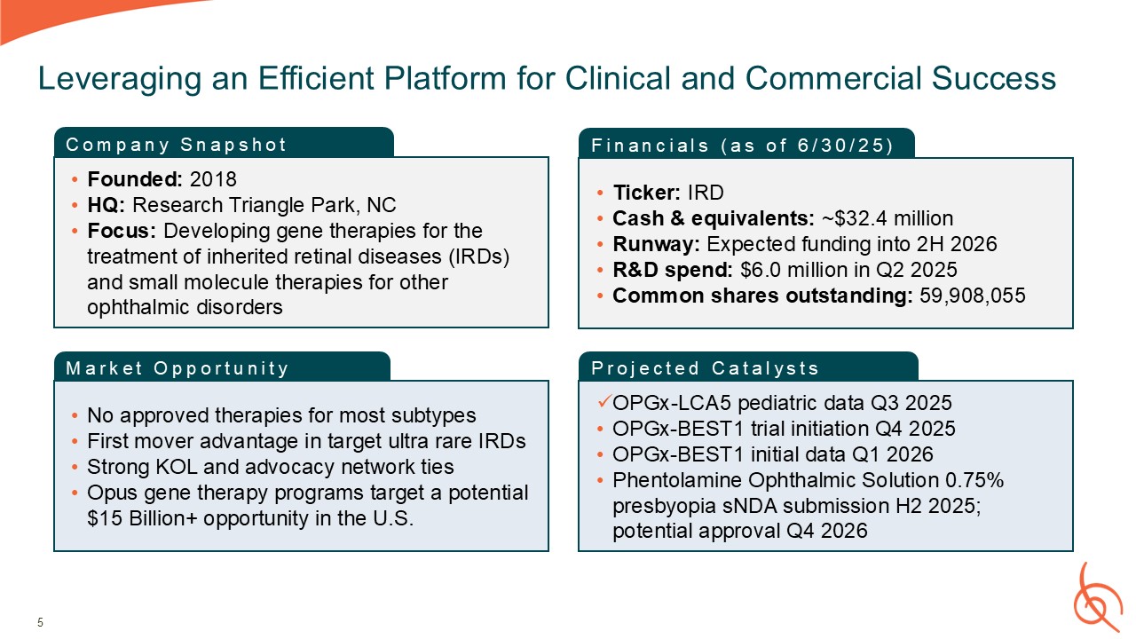Leveraging an Efficient Platform for Clinical and Commercial Success  Founded: 2018  HQ: Research Triangle Park, NC  Focus: Developing gene therapies for the treatment of inherited retinal diseases (IRDs) and small molecule therapies for other ophthalmic disorders  Company Snapshot  No approved therapies for most subtypes  First mover advantage in target ultra rare IRDs  Strong KOL and advocacy network ties  Opus gene therapy programs target a potential $15 Billion+ opportunity in the U.S.  Market Opportunity  OPGx-LCA5 pediatric data Q3 2025  OPGx-BEST1 trial initiation Q4 2025  OPGx-BEST1 initial data Q1 2026  Phentolamine Ophthalmic Solution 0.75% presbyopia sNDA submission H2 2025; potential approval Q4 2026  Projected Catalysts  Financials (as of 6/30/25)  Ticker: IRD  Cash & equivalents: ~$32.4 million  Runway: Expected funding into 2H 2026  R&D spend: $6.0 million in Q2 2025  Common shares outstanding: 59,908,055  5