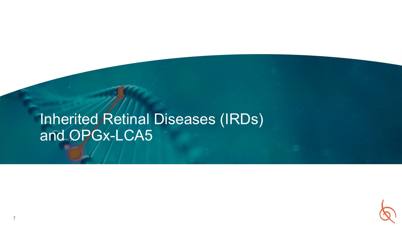 U.S. Prevalence  Preclinical  IND-enabling  Phase 1/2  Phase 2/3  Rare Pediatric  Orphan Drug  Status  OPGx-LCA5  LCA  ~200 patients1,2  Granted  3-month pediatric & 18-month adult data in Q3 2025  Co-funded by FDA OOPD  OPGx-BEST1  Bestrophinopathies  ~9,000 patients1,2  Eligible  Initiate clinical trial in Q4 2025  Initial data expected Q1 2026  Future IRD Programs  OPGx-RHO  adRP  ~5,600 patients2  Eligible  IND-enabling studies  Co-funded by FFB & NIH  OPGx-RDH12  LCA  ~1,100 patients1,2  Eligible  IND-enabling studies  Co-funded by Global RDH12 Alliance  OPGx-MERTK  RP  ~600 patients1  Eligible  IND-enabling studies  Co-funded by FFB RD Fund   OPGx-NMNAT1  LCA  ~800 patients1  Eligible  Pre-IND  OPGx-CNGB1  RP  ~400 patients1  Granted  Pre-IND  NIH-funded consortium  Efficient IRD Pipeline with Multiple Near-Term Value Inflection Points Anticipated  6  1. Stone et al. Ophthalmology. 2017;124:1314-1331. 2. Triangle Insights Group market research (compilation of prevalence studies), conducted August 2023.   Lead Candidates  adRP, autosomal dominant retinitis pigmentosa; BEST1, bestrophin 1; CNGB1, cyclic nucleotide-gated channel β1; FDA, Food and Drug Administration; GLP, Good Laboratory Practices; IND, Investigational New Drug; IRD, inherited retinal disease; LCA, Leber congenital amaurosis; MERTK, MER proto-oncogene tyrosine kinase; NHP, nonhuman primate; NMNAT1, nicotinamide mononucleotide adenylyltransferase 1; ODD, Orphan Drug Designation; RDH12, retinol dehydrogenase 12; RHO, rhodopsin; RP, retinitis pigmentosa; RPDD, Rare Pediatric Disease Designation; FFB, Foundation Fighting Blindness; FDA OOPD, Office of Orphan Products Development