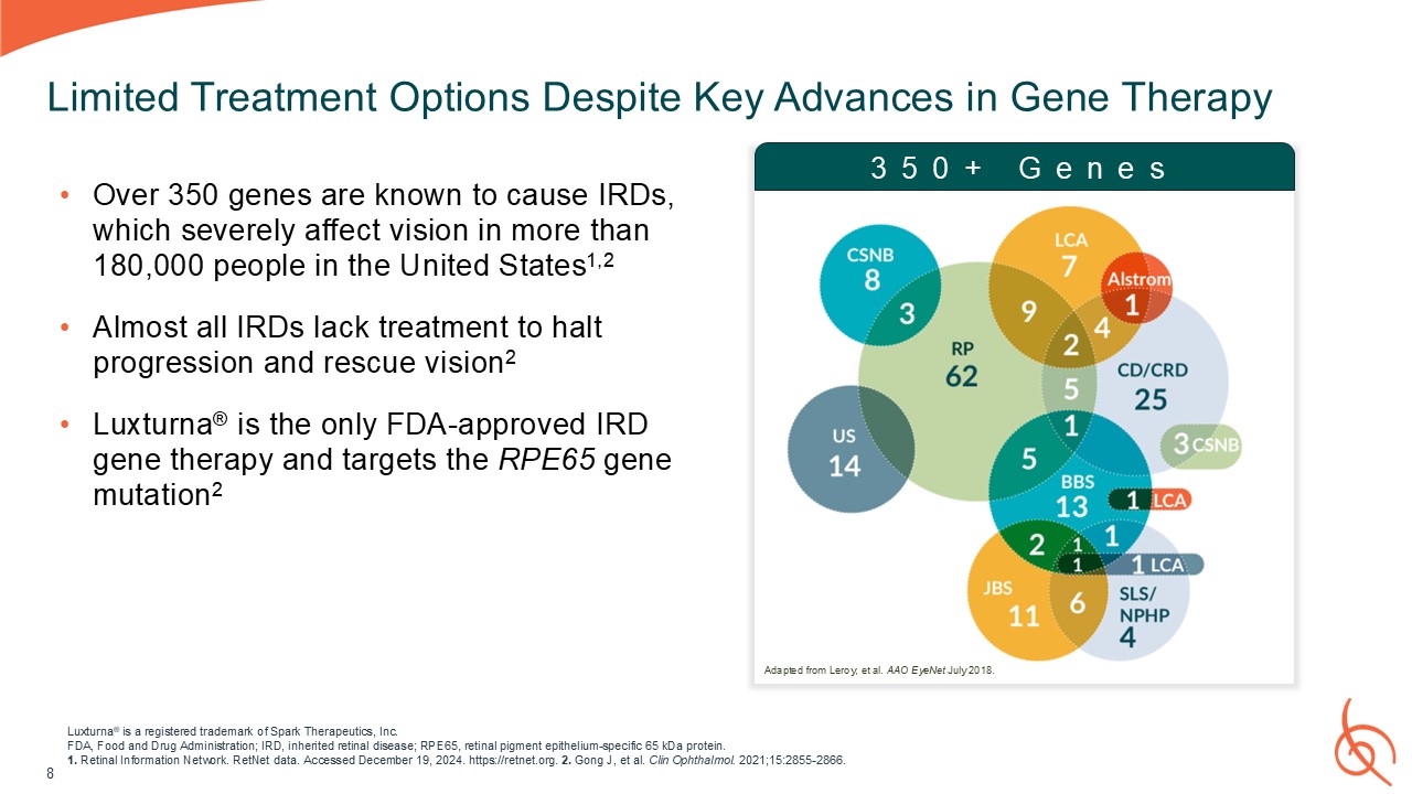 8  Over 350 genes are known to cause IRDs, which severely affect vision in more than 180,000 people in the United States1,2  Almost all IRDs lack treatment to halt progression and rescue vision2  Luxturna® is the only FDA-approved IRD gene therapy and targets the RPE65 gene mutation2  Luxturna® is a registered trademark of Spark Therapeutics, Inc.  FDA, Food and Drug Administration; IRD, inherited retinal disease; RPE65, retinal pigment epithelium-specific 65 kDa protein.  1. Retinal Information Network. RetNet data. Accessed December 19, 2024. https://retnet.org. 2. Gong J, et al. Clin Ophthalmol. 2021;15:2855-2866.   350+ Genes  Adapted from Leroy, et al. AAO EyeNet July 2018.  Limited Treatment Options Despite Key Advances in Gene Therapy