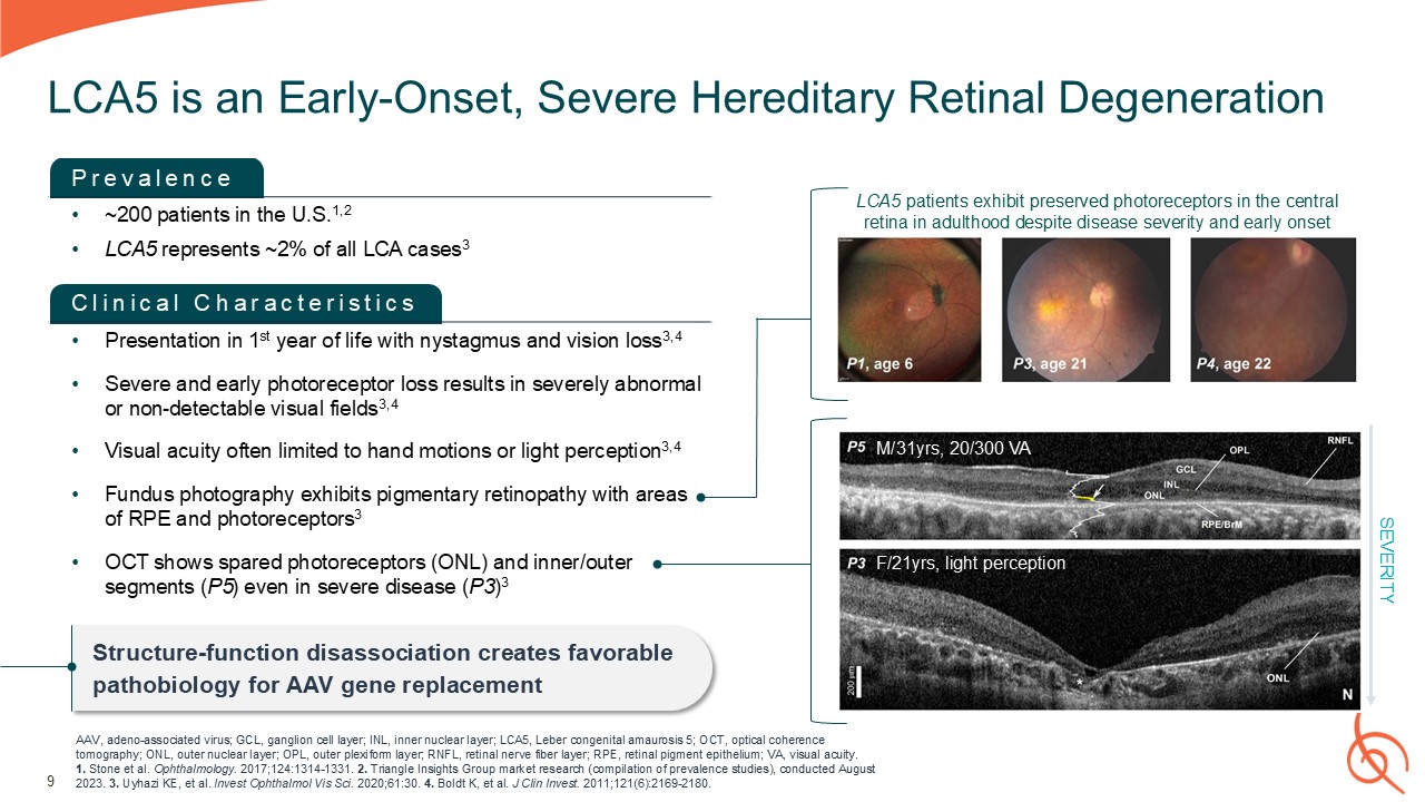 LCA5 is an Early-Onset, Severe Hereditary Retinal Degeneration   9  Prevalence  ~200 patients in the U.S.1,2  LCA5 represents ~2% of all LCA cases3  Clinical Characteristics  Presentation in 1st year of life with nystagmus and vision loss3,4  Severe and early photoreceptor loss results in severely abnormal or non-detectable visual fields3,4  Visual acuity often limited to hand motions or light perception3,4  Fundus photography exhibits pigmentary retinopathy with areas of RPE and photoreceptors3  OCT shows spared photoreceptors (ONL) and inner/outer segments (P5) even in severe disease (P3)3  SEVERITY  M/31yrs, 20/300 VA  F/21yrs, light perception  LCA5 patients exhibit preserved photoreceptors in the central retina in adulthood despite disease severity and early onset  AAV, adeno-associated virus; GCL, ganglion cell layer; INL, inner nuclear layer; LCA5, Leber congenital amaurosis 5; OCT, optical coherence tomography; ONL, outer nuclear layer; OPL, outer plexiform layer; RNFL, retinal nerve fiber layer; RPE, retinal pigment epithelium; VA, visual acuity.  1. Stone et al. Ophthalmology. 2017;124:1314-1331. 2. Triangle Insights Group market research (compilation of prevalence studies), conducted August 2023. 3. Uyhazi KE, et al. Invest Ophthalmol Vis Sci. 2020;61:30. 4. Boldt K, et al. J Clin Invest. 2011;121(6):2169-2180.   Structure-function disassociation creates favorable pathobiology for AAV gene replacement