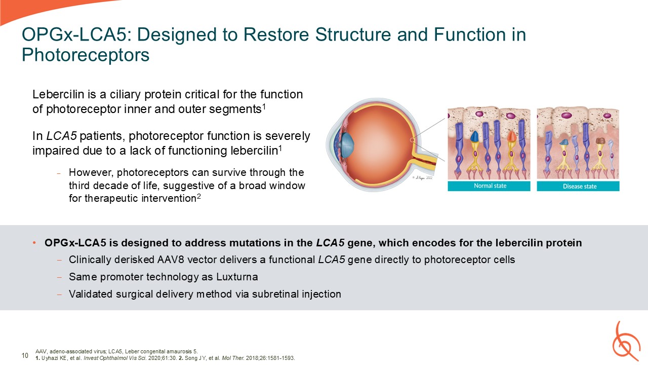 OPGx-LCA5: Designed to Restore Structure and Function in Photoreceptors  10  Lebercilin is a ciliary protein critical for the function of photoreceptor inner and outer segments1   In LCA5 patients, photoreceptor function is severely impaired due to a lack of functioning lebercilin1  However, photoreceptors can survive through the third decade of life, suggestive of a broad window for therapeutic intervention2  OPGx-LCA5 is designed to address mutations in the LCA5 gene, which encodes for the lebercilin protein  Clinically derisked AAV8 vector delivers a functional LCA5 gene directly to photoreceptor cells  Same promoter technology as Luxturna  Validated surgical delivery method via subretinal injection  AAV, adeno-associated virus; LCA5, Leber congenital amaurosis 5.  1. Uyhazi KE, et al. Invest Ophthalmol Vis Sci. 2020;61:30. 2. Song JY, et al. Mol Ther. 2018;26:1581-1593.