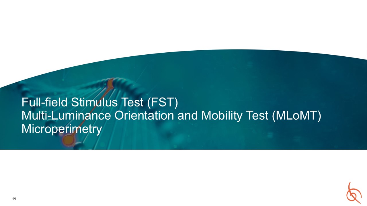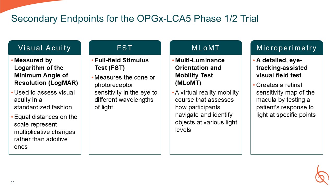 Secondary Endpoints for the OPGx-LCA5 Phase 1/2 Trial  Visual Acuity  Measured by Logarithm of the Minimum Angle of Resolution (LogMAR)  Used to assess visual acuity in a standardized fashion   Equal distances on the scale represent multiplicative changes rather than additive ones  FST  Full-field Stimulus Test (FST)  Measures the cone or photoreceptor sensitivity in the eye to different wavelengths of light  MLoMT   Multi-Luminance Orientation and Mobility Test (MLoMT)  A virtual reality mobility course that assesses how participants navigate and identify objects at various light levels  Microperimetry   A detailed, eye-tracking-assisted visual field test  Creates a retinal sensitivity map of the macula by testing a patient's response to light at specific points   11