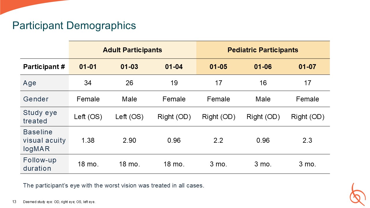 Deemed study eye: OD, right eye; OS, left eye.   Participant Demographics  13  Adult Participants  Pediatric Participants  Participant #  01-01  01-03  01-04  01-05  01-06  01-07  Age  34  26  19  17  16  17  Gender  Female  Male  Female  Female  Male  Female  Study eye treated  Left (OS)  Left (OS)  Right (OD)  Right (OD)  Right (OD)  Right (OD)  Baseline visual acuity logMAR   1.38  2.90  0.96  2.2  0.96  2.3  Follow-up duration  18 mo.  18 mo.  18 mo.  3 mo.  3 mo.  3 mo.  The participant’s eye with the worst vision was treated in all cases.