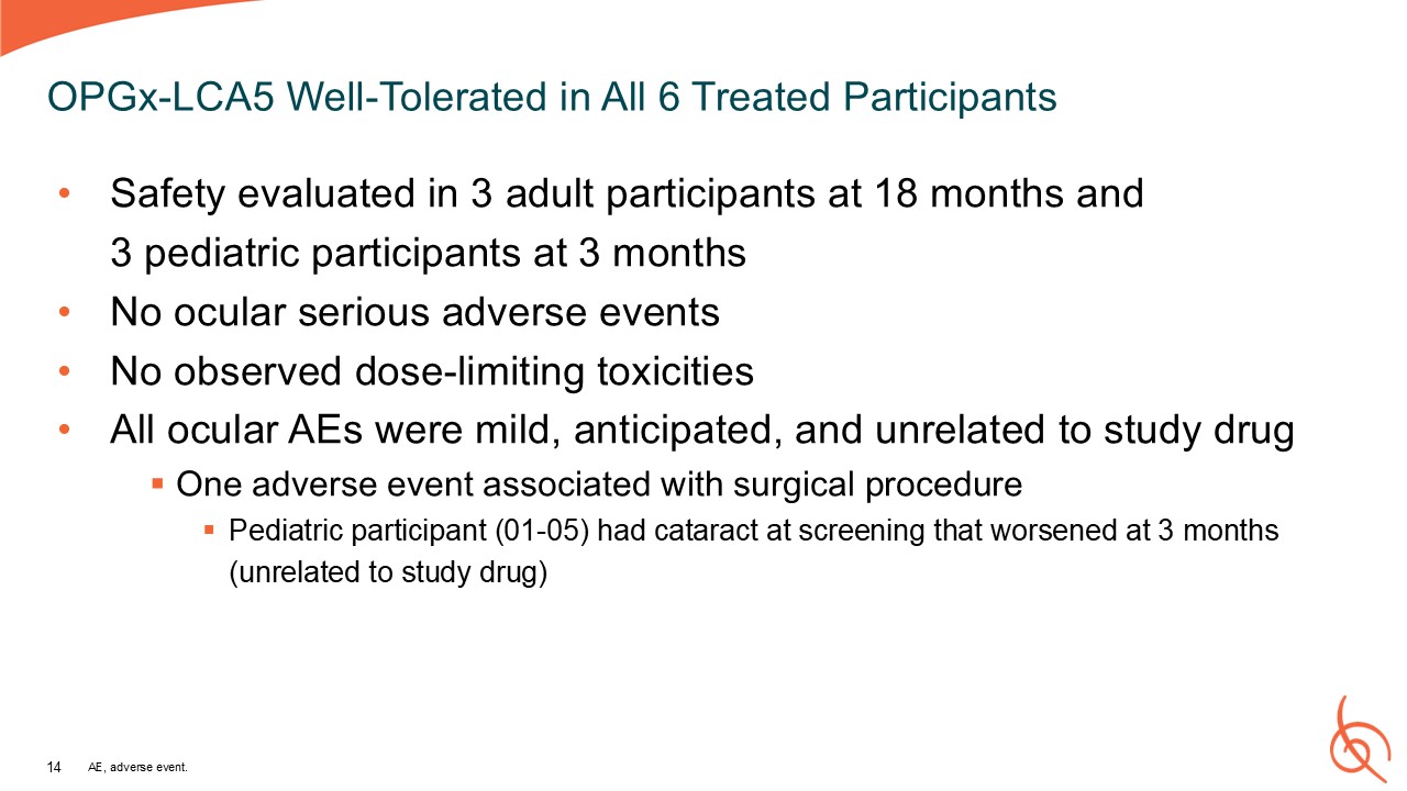 Safety evaluated in 3 adult participants at 18 months and 3 pediatric participants at 3 months  No ocular serious adverse events  No observed dose-limiting toxicities  All ocular AEs were mild, anticipated, and unrelated to study drug  One adverse event associated with surgical procedure  Pediatric participant (01-05) had cataract at screening that worsened at 3 months (unrelated to study drug)   OPGx-LCA5 Well-Tolerated in All 6 Treated Participants  AE, adverse event.  14