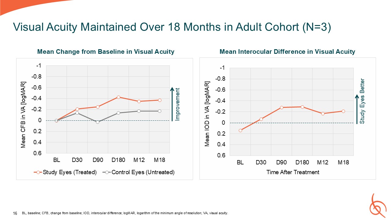 Visual Acuity Maintained Over 18 Months in Adult Cohort (N=3)  BL, baseline; CFB, change from baseline; IOD, interocular difference; logMAR, logarithm of the minimum angle of resolution; VA, visual acuity.  Improvement  Study Eyes Better  Mean Change from Baseline in Visual Acuity  Mean Interocular Difference in Visual Acuity  16