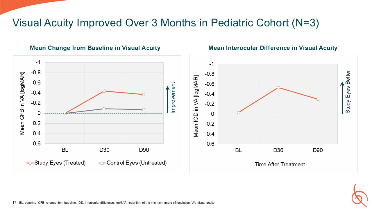 Visual Acuity Improved Over 3 Months in Pediatric Cohort (N=3)  Improvement     BL, baseline; CFB, change from baseline; IOD, interocular difference; logMAR, logarithm of the minimum angle of resolution; VA, visual acuity.  Study Eyes Better  Mean Change from Baseline in Visual Acuity  Mean Interocular Difference in Visual Acuity  17
