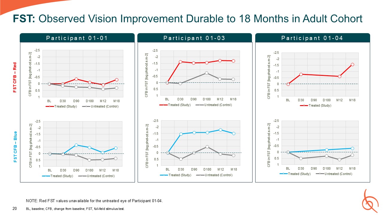 BL, baseline; CFB, change from baseline; FST, full-field stimulus test.   FST: Observed Vision Improvement Durable to 18 Months in Adult Cohort  Participant 01-03  Participant 01-01  Participant 01-04  FST CFB – Red  FST CFB – Blue  20  NOTE: Red FST values unavailable for the untreated eye of Participant 01-04.