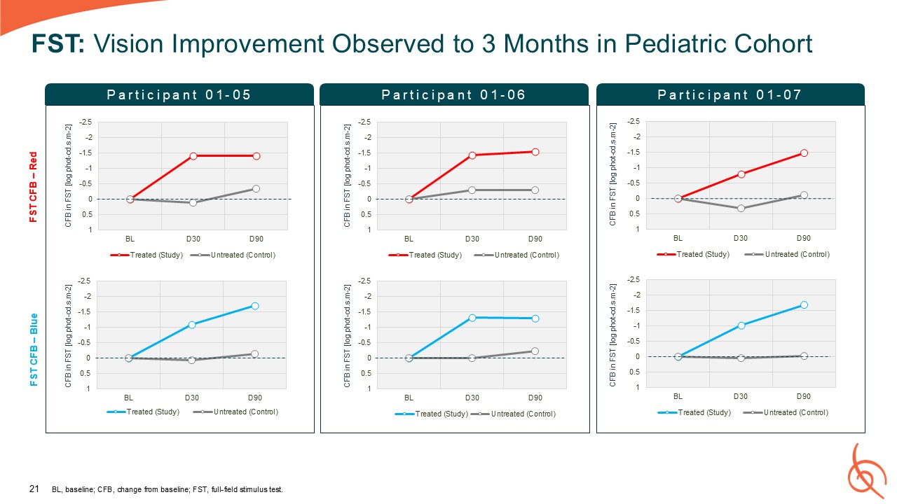 Participant 01-06  Participant 01-05  Participant 01-07  BL, baseline; CFB, change from baseline; FST, full-field stimulus test.   FST: Vision Improvement Observed to 3 Months in Pediatric Cohort  FST CFB – Red  FST CFB – Blue  21