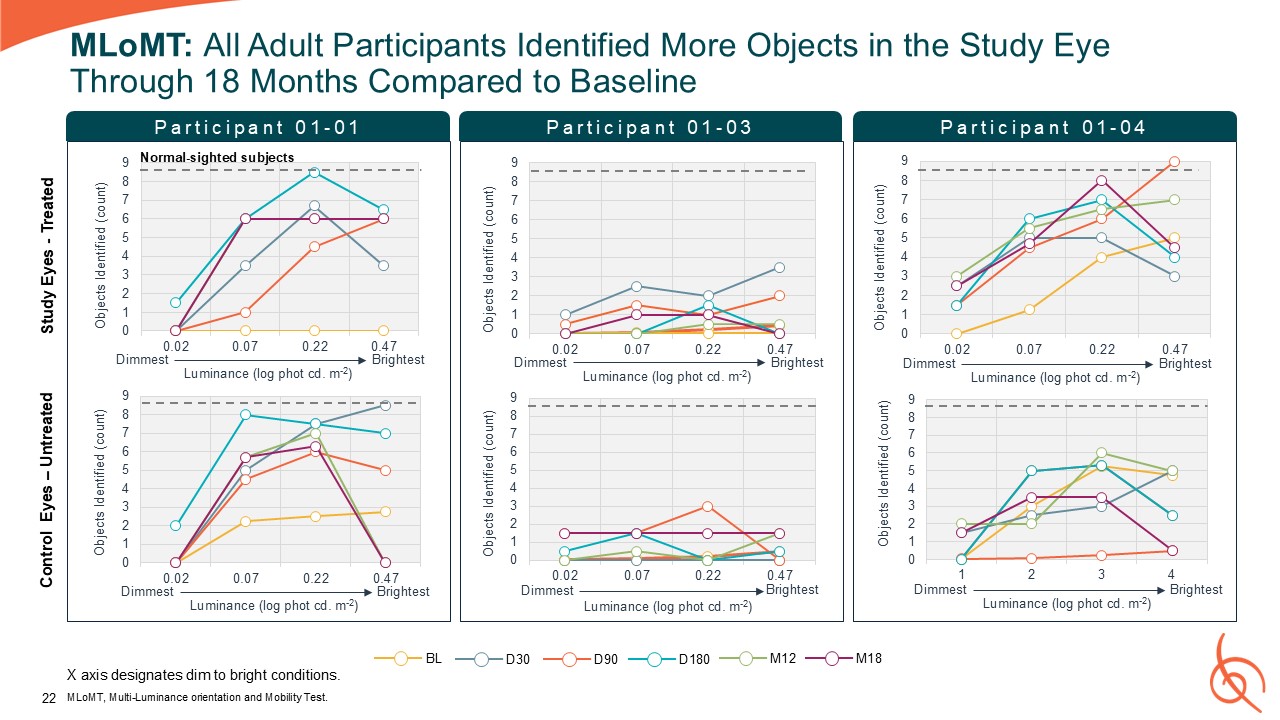 MLoMT: All Adult Participants Identified More Objects in the Study Eye Through 18 Months Compared to Baseline  Participant 01-03  Participant 01-01  Participant 01-04  Control Eyes – Untreated  22  Objects Identified (count)  Brightest  Luminance (log phot cd. m-2)  Objects Identified (count)  Dimmest  Normal-sighted subjects  Objects Identified (count)  Study Eyes - Treated  Objects Identified (count)  Brightest  Luminance (log phot cd. m-2)  Objects Identified (count)  Dimmest  Objects Identified (count)  MLoMT, Multi-Luminance orientation and Mobility Test.   BL  D90  D180  M12  M18  D30  Brightest  Luminance (log phot cd. m-2)  Dimmest  Brightest  Luminance (log phot cd. m-2)  Dimmest  Brightest  Luminance (log phot cd. m-2)  Dimmest  Brightest  Luminance (log phot cd. m-2)  Dimmest  X axis designates dim to bright conditions.
