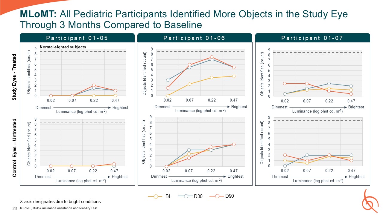 MLoMT: All Pediatric Participants Identified More Objects in the Study Eye Through 3 Months Compared to Baseline   Participant 01-06  Participant 01-05  Participant 01-07  Control Eyes – Untreated  23  Study Eyes - Treated  MLoMT, Multi-Luminance orientation and Mobility Test.   Objects Identified (count)  Normal-sighted subjects  Objects Identified (count)  Objects Identified (count)  BL  D90  D30  Objects Identified (count)  Objects Identified (count)  Objects Identified (count)  Brightest  Luminance (log phot cd. m-2)  Dimmest  Brightest  Luminance (log phot cd. m-2)  Dimmest  Brightest  Luminance (log phot cd. m-2)  Dimmest  Brightest  Luminance (log phot cd. m-2)  Dimmest  Brightest  Luminance (log phot cd. m-2)  Dimmest  Brightest  Luminance (log phot cd. m-2)  Dimmest  X axis designates dim to bright conditions.