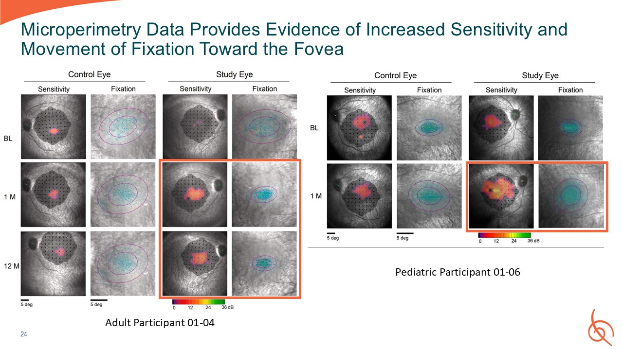 24  Microperimetry Data Provides Evidence of Increased Sensitivity and Movement of Fixation Toward the Fovea  Adult Participant 01-04  Pediatric Participant 01-06
