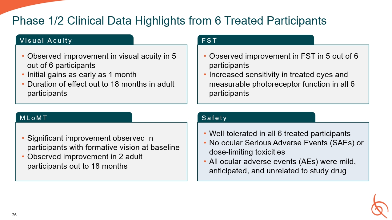 25  Phase 1/2 Clinical Data Highlights in Pediatric Cohort (N=3)  Visual Acuity: Observed improvement with initial gains as early as 1 month  FST: Observed improvement with increased sensitivity in treated eyes and measurable photoreceptor function  MLoMT: Observed improvement from baseline out to 3 months  Safety: Well-tolerated with no ocular SAEs or dose-limiting toxicities; all ocular AEs were mild, anticipated, and unrelated to study drug  One pediatric participant had cataract at screening that worsened at 3 months (unrelated to study drug)