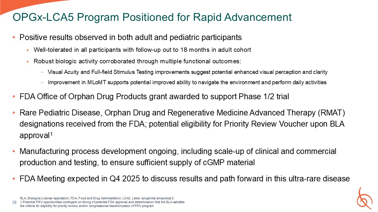 Positive results observed in both adult and pediatric participants  Well-tolerated in all participants with follow-up out to 18 months in adult cohort  Robust biologic activity corroborated through multiple functional outcomes:​  Visual Acuity and Full-field Stimulus Testing improvements suggest potential enhanced visual perception and clarity​  Improvement in MLoMT supports potential improved ability to navigate the environment and perform daily activities​  FDA Office of Orphan Drug Products grant awarded to support Phase 1/2 trial   Rare Pediatric Disease, Orphan Drug and Regenerative Medicine Advanced Therapy (RMAT) designations received from the FDA; potential eligibility for Priority Review Voucher upon BLA approval1  Manufacturing process development ongoing, including scale-up of clinical and commercial production and testing, to ensure sufficient supply of cGMP material  FDA Meeting expected in Q4 2025 to discuss results and path forward in this ultra-rare disease  28  OPGx-LCA5 Program Positioned for Rapid Advancement  BLA, Biologics License Application; FDA, Food and Drug Administration; LCA5, Leber congenital amaurosis 5.  1.Potential PRV opportunities contingent on timing of potential FDA approval and determination that the BLA satisfies the criteria for eligibility for priority review, and/or congressional reauthorization of PRV program