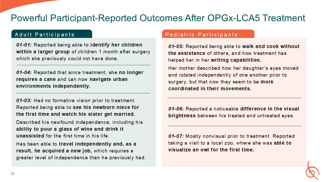 29  Powerful Participant-Reported Outcomes After OPGx-LCA5 Treatment  Adult Participants  01-01: Reported being able to identify her children within a larger group of children 1 month after surgery which she previously could not have done.  01-03: Had no formative vision prior to treatment. Reported being able to see his newborn niece for the first time and watch his sister get married.  Described his newfound independence, including his ability to pour a glass of wine and drink it unassisted for the first time in his life.   Has been able to travel independently and, as a result, he acquired a new job, which requires a greater level of independence than he previously had.  01-04: Reported that since treatment, she no longer requires a cane and can now navigate urban environments independently.  Pediatric Participants  01-05: Reported being able to walk and cook without the assistance of others, and how treatment has helped her in her writing capabilities.  Her mother described how her daughter’s eyes moved and rotated independently of one another prior to surgery, but that now they seem to be more coordinated in their movements.  01-06: Reported a noticeable difference in the visual brightness between his treated and untreated eyes.  01-07: Mostly nonvisual prior to treatment. Reported taking a visit to a local zoo, where she was able to visualize an owl for the first time.