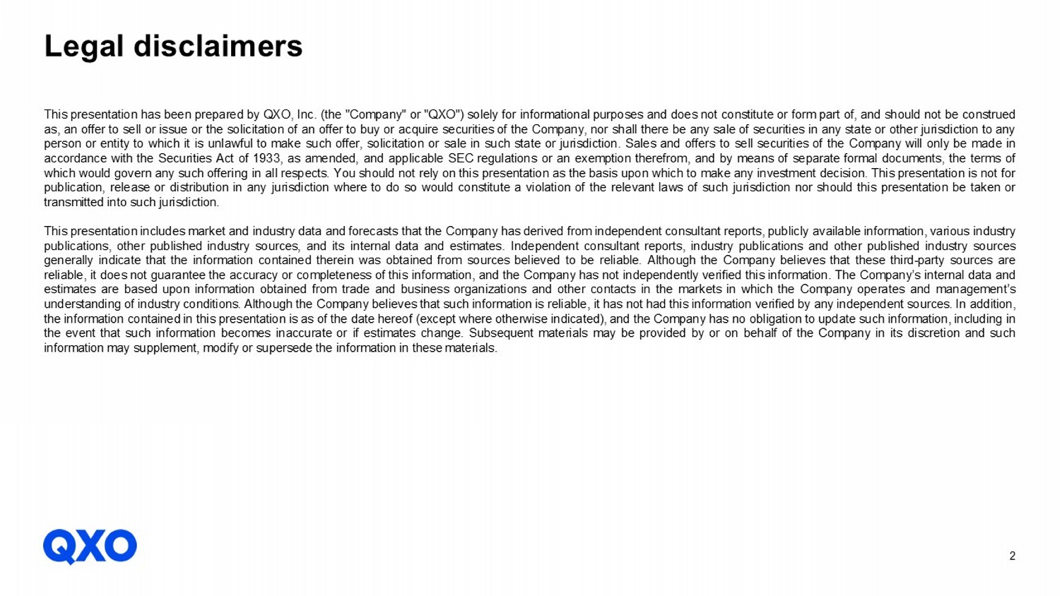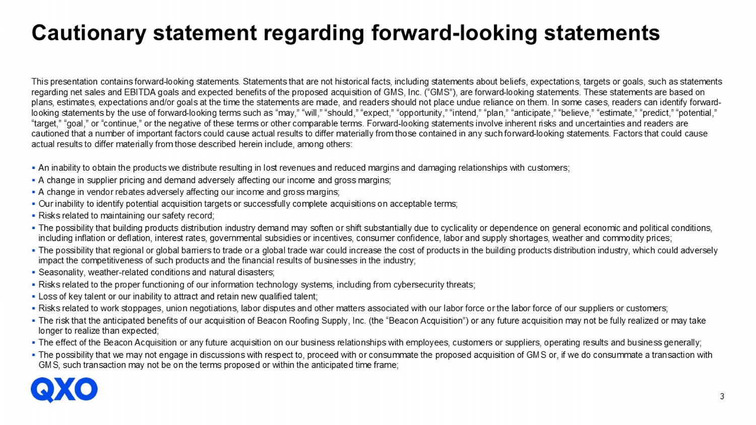 2 This presentation has been prepared by QXO, Inc . (the "Company" or "QXO") solely for informational purposes and does not constitute or form part of, and should not be construed as, an offer to sell or issue or the solicitation of an offer to buy or acquire securities of the Company, nor shall there be any sale of securities in any state or other jurisdiction to any person or entity to which it is unlawful to make such offer, solicitation or sale in such state or jurisdiction . Sales and offers to sell securities of the Company will only be made in accordance with the Securities Act of 1933 , as amended, and applicable SEC regulations or an exemption therefrom, and by means of separate formal documents, the terms of which would govern any such offering in all respects . You should not rely on this presentation as the basis upon which to make any investment decision . This presentation is not for publication, release or distribution in any jurisdiction where to do so would constitute a violation of the relevant laws of such jurisdiction nor should this presentation be taken or transmitted into such jurisdiction . This presentation includes market and industry data and forecasts that the Company has derived from independent consultant reports, publicly available information, various industry publications, other published industry sources, and its internal data and estimates . Independent consultant reports, industry publications and other published industry sources generally indicate that the information contained therein was obtained from sources believed to be reliable . Although the Company believes that these third - party sources are reliable, it does not guarantee the accuracy or completeness of this information, and the Company has not independently verified this information . The Company’s internal data and estimates are based upon information obtained from trade and business organizations and other contacts in the markets in which the Company operates and management’s understanding of industry conditions . Although the Company believes that such information is reliable, it has not had this information verified by any independent sources . In addition, the information contained in this presentation is as of the date hereof (except where otherwise indicated), and the Company has no obligation to update such information, including in the event that such information becomes inaccurate or if estimates change . Subsequent materials may be provided by or on behalf of the Company in its discretion and such information may supplement, modify or supersede the information in these materials . Legal disclaimers