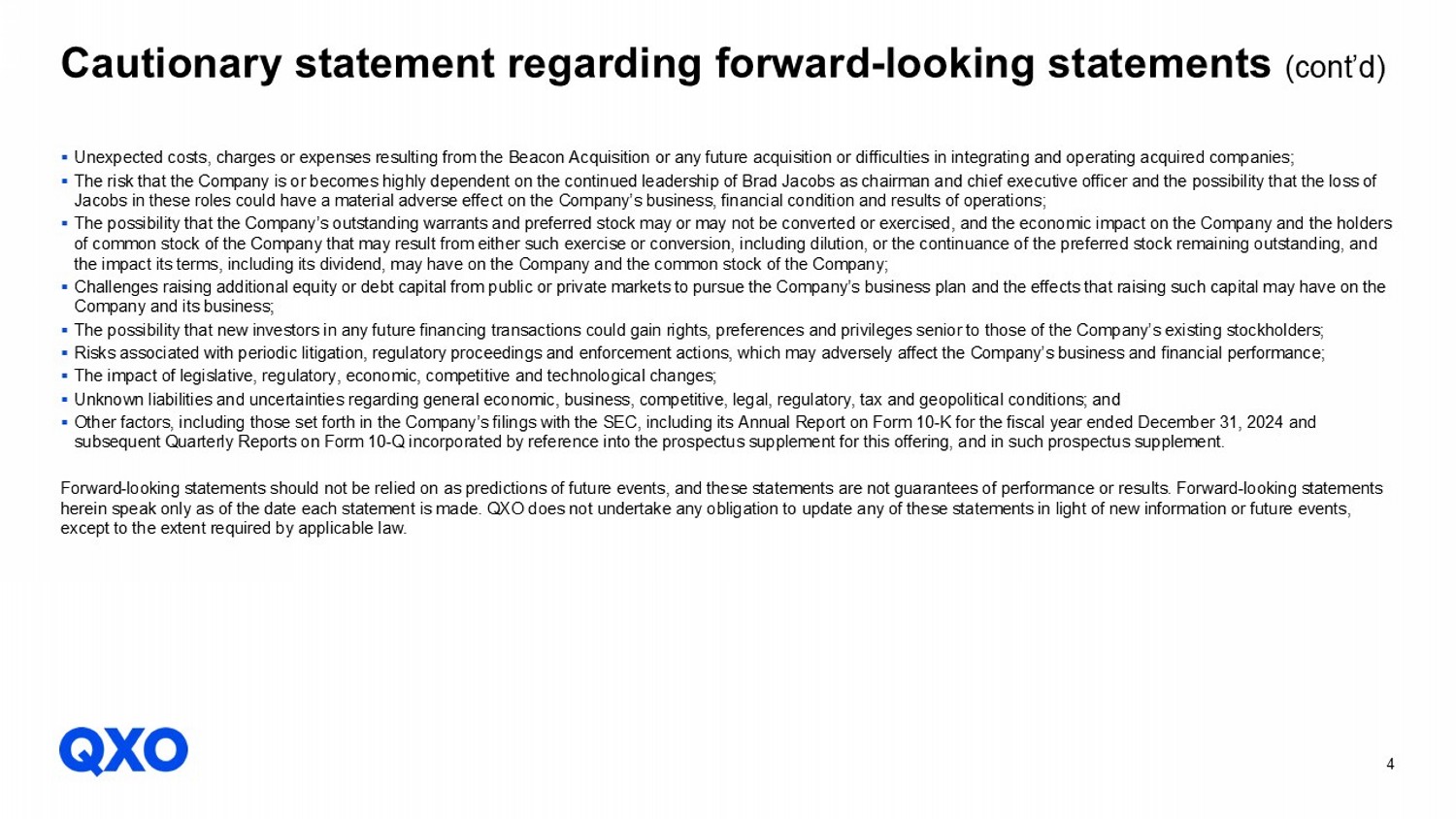 4 ▪ Unexpected costs, charges or expenses resulting from the Beacon Acquisition or any future acquisition or difficulties in inte gra ting and operating acquired companies; ▪ The risk that the Company is or becomes highly dependent on the continued leadership of Brad Jacobs as chairman and chief exe cut ive officer and the possibility that the loss of Jacobs in these roles could have a material adverse effect on the Company’s business, financial condition and results of oper ati ons; ▪ The possibility that the Company’s outstanding warrants and preferred stock may or may not be converted or exercised, and the ec onomic impact on the Company and the holders of common stock of the Company that may result from either such exercise or conversion, including dilution, or the continuanc e o f the preferred stock remaining outstanding, and the impact its terms, including its dividend, may have on the Company and the common stock of the Company; ▪ Challenges raising additional equity or debt capital from public or private markets to pursue the Company’s business plan and th e effects that raising such capital may have on the Company and its business; ▪ The possibility that new investors in any future financing transactions could gain rights, preferences and privileges senior to those of the Company’s existing stockholders; ▪ Risks associated with periodic litigation, regulatory proceedings and enforcement actions, which may adversely affect the Com pan y’s business and financial performance; ▪ The impact of legislative, regulatory, economic, competitive and technological changes; ▪ Unknown liabilities and uncertainties regarding general economic, business, competitive, legal, regulatory, tax and geopoliti cal conditions; and ▪ Other factors, including those set forth in the Company’s filings with the SEC, including its Annual Report on Form 10 - K for the fiscal year ended December 31, 2024 and subsequent Quarterly Reports on Form 10 - Q incorporated by reference into the prospectus supplement for this offering, and in suc h prospectus supplement. Forward - looking statements should not be relied on as predictions of future events, and these statements are not guarantees of p erformance or results. Forward - looking statements herein speak only as of the date each statement is made. QXO does not undertake any obligation to update any of these stateme nts in light of new information or future events, except to the extent required by applicable law. Cautionary statement regarding forward - looking statements (cont’d)