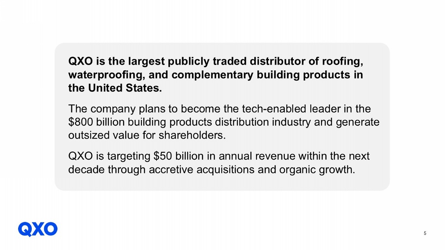 5 QXO is the largest publicly traded distributor of roofing, waterproofing, and complementary building products in the United States. The company plans to become the tech - enabled leader in the $800 billion building products distribution industry and generate outsized value for shareholders. QXO is targeting $50 billion in annual revenue within the next decade through accretive acquisitions and organic growth.
