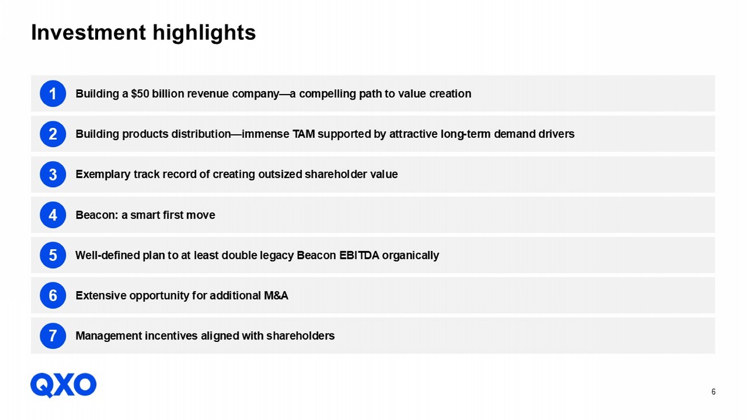 6 Investment highlights Building products distribution — immense TAM supported by attractive long - term demand drivers 2 Beacon: a smart first move 4 Well - defined plan to at least double legacy Beacon EBITDA organically 5 Extensive opportunity for additional M&A 6 Exemplary track record of creating outsized shareholder value 3 Building a $50 billion revenue company — a compelling path to value creation 1 Management incentives aligned with shareholders 7