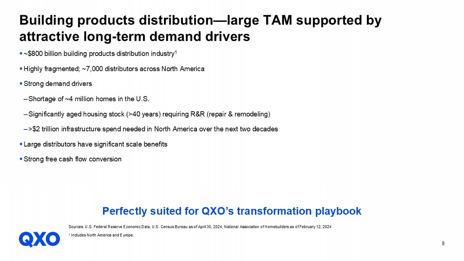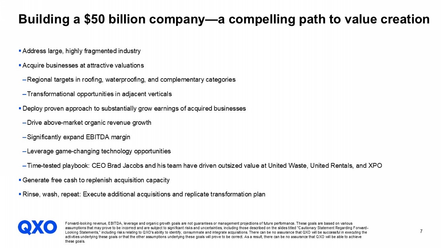 7 ▪ Address large, highly fragmented industry ▪ Acquire businesses at attractive valuations ‒ Regional targets in roofing, waterproofing, and complementary categories ‒ Transformational opportunities in adjacent verticals ▪ Deploy proven approach to substantially grow earnings of acquired businesses ‒ Drive above - market organic revenue growth ‒ Significantly expand EBITDA margin ‒ Leverage game - changing technology opportunities ‒ Time - tested playbook: CEO Brad Jacobs and his team have driven outsized value at United Waste, United Rentals, and XPO ▪ Generate free cash to replenish acquisition capacity ▪ Rinse, wash, repeat: Execute additional acquisitions and replicate transformation plan Building a $50 billion company — a compelling path to value creation Forward - looking revenue, EBITDA, leverage and organic growth goals are not guarantees or management projections of future perfor mance. These goals are based on various assumptions that may prove to be incorrect and are subject to significant risks and uncertainties, including those described on the slides titled "Cautionary Statement Regarding Forward - Looking Statements," including risks relating to QXO's ability to identify, consummate and integrate acquisitions. There can be no assurance that QXO will be successful in executing the activities underlying these goals or that the other assumptions underlying these goals will prove to be correct. As a result, th ere can be no assurance that QXO will be able to achieve these goals.