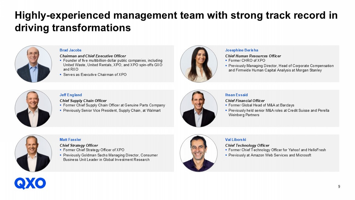 8 ▪ ~$800 billion building products distribution industry 1 ▪ Highly fragmented; ~7,000 distributors across North America ▪ Strong demand drivers ‒ Shortage of ~4 million homes in the U.S. ‒ Significantly aged housing stock (>40 years) requiring R&R (repair & remodeling) ‒ >$2 trillion infrastructure spend needed in North America over the next two decades ▪ Large distributors have significant scale benefits ▪ Strong free cash flow conversion Building products distribution — large TAM supported by attractive long - term demand drivers Perfectly suited for QXO’s transformation playbook 1 Includes North America and Europe. Sources: U.S. Federal Reserve Economic Data, U.S. Census Bureau as of April 30, 2024, National Association of Homebuilders as of Febru ary 12, 2024