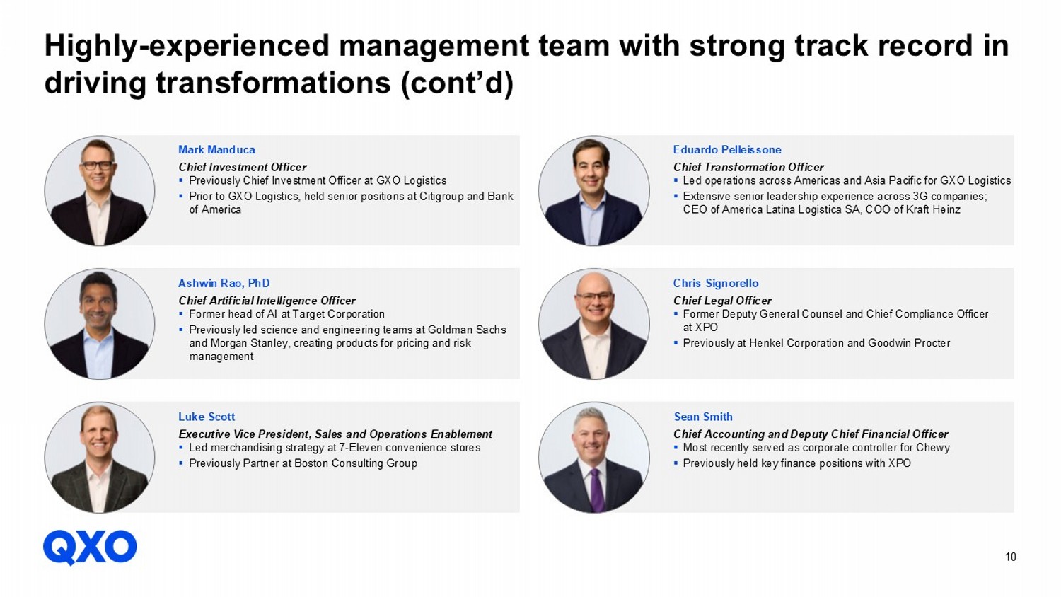 9 Highly - experienced management team with strong track record in driving transformations Brad Jacobs Chairman and Chief Executive Officer ▪ Founder of five multibillion - dollar public companies, including United Waste, United Rentals, XPO, and XPO spin - offs GXO and RXO ▪ Serves as Executive Chairman of XPO Matt Fassler Chief Strategy Officer ▪ Former Chief Strategy Officer of XPO ▪ Previously Goldman Sachs Managing Director, Consumer Business Unit Leader in Global Investment Research Ihsan Essaid Chief Financial Officer ▪ Former Global Head of M&A at Barclays ▪ Previously held senior M&A roles at Credit Suisse and Perella Weinberg Partners Jeff England Chief Supply Chain Officer ▪ Former Chief Supply Chain Officer at Genuine Parts Company ▪ Previously Senior Vice President, Supply Chain, at Walmart Val Liborski Chief Technology Officer ▪ Former Chief Technology Officer for Yahoo! and HelloFresh ▪ Previously at Amazon Web Services and Microsoft Josephine Berisha Chief Human Resources Officer ▪ Former CHRO of XPO ▪ Previously Managing Director, Head of Corporate Compensation and Firmwide Human Capital Analysis at Morgan Stanley