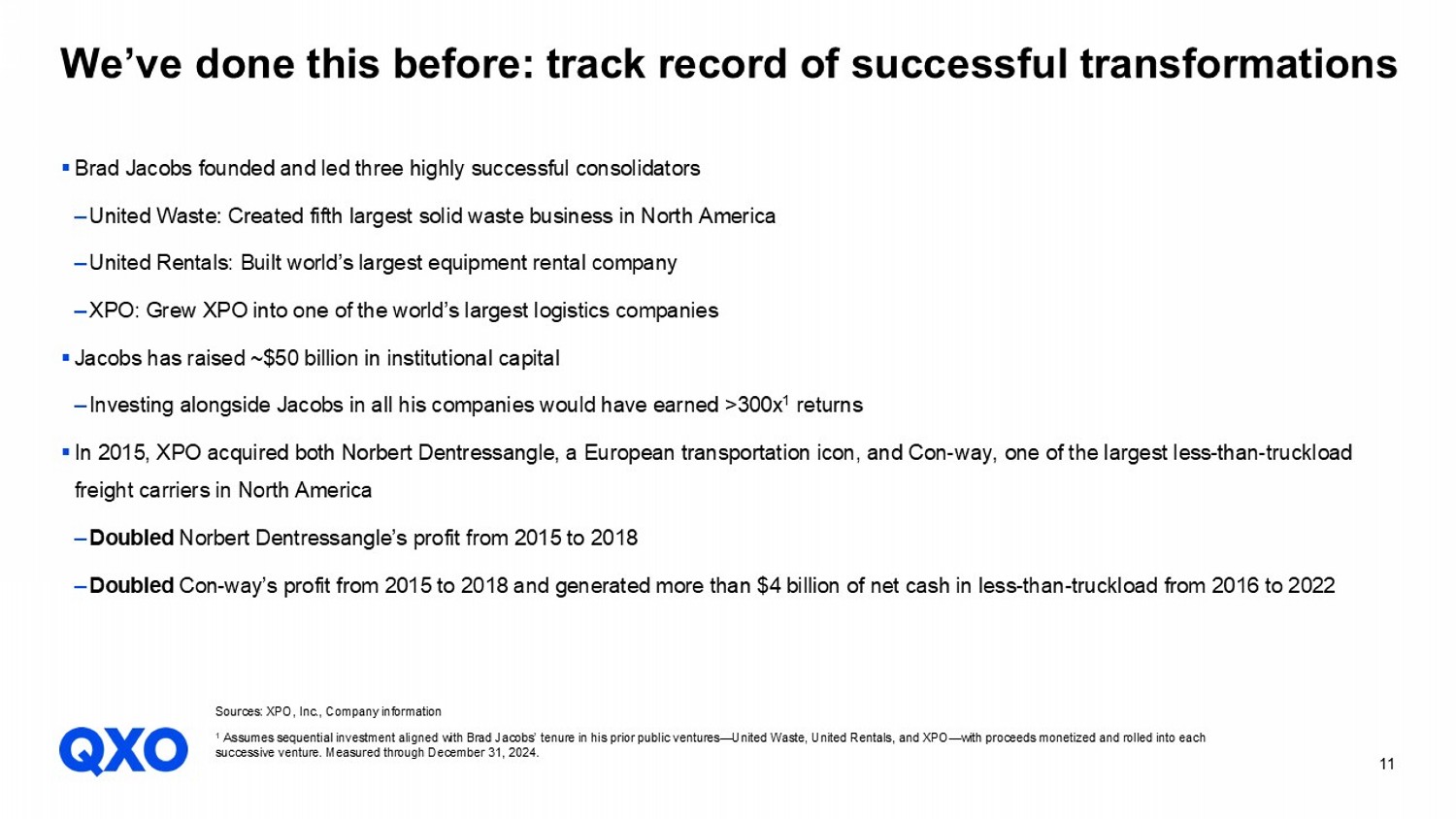 11 ▪ Brad Jacobs founded and led three highly successful consolidators ‒ United Waste: Created fifth largest solid waste business in North America ‒ United Rentals: Built world’s largest equipment rental company ‒ XPO: Grew XPO into one of the world’s largest logistics companies ▪ Jacobs has raised ~$50 billion in institutional capital ‒ Investing alongside Jacobs in all his companies would have earned >300x 1 returns ▪ In 2015, XPO acquired both Norbert Dentressangle, a European transportation icon, and Con - way, one of the largest less - than - truc kload freight carriers in North America ‒ Doubled Norbert Dentressangle’s profit from 2015 to 2018 ‒ Doubled Con - way’s profit from 2015 to 2018 and generated more than $4 billion of net cash in less - than - truckload from 2016 to 2022 We’ve done this before: track record of successful transformations 1 Assumes sequential investment aligned with Brad Jacobs’ tenure in his prior public ventures — United Waste, United Rentals, and XP O — with proceeds monetized and rolled into each successive venture. Measured through December 31, 2024. Sources: XPO, Inc., Company information