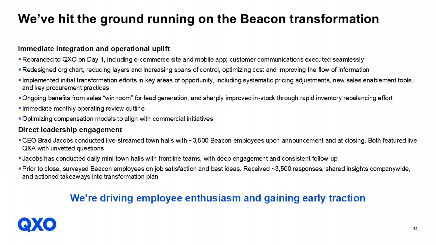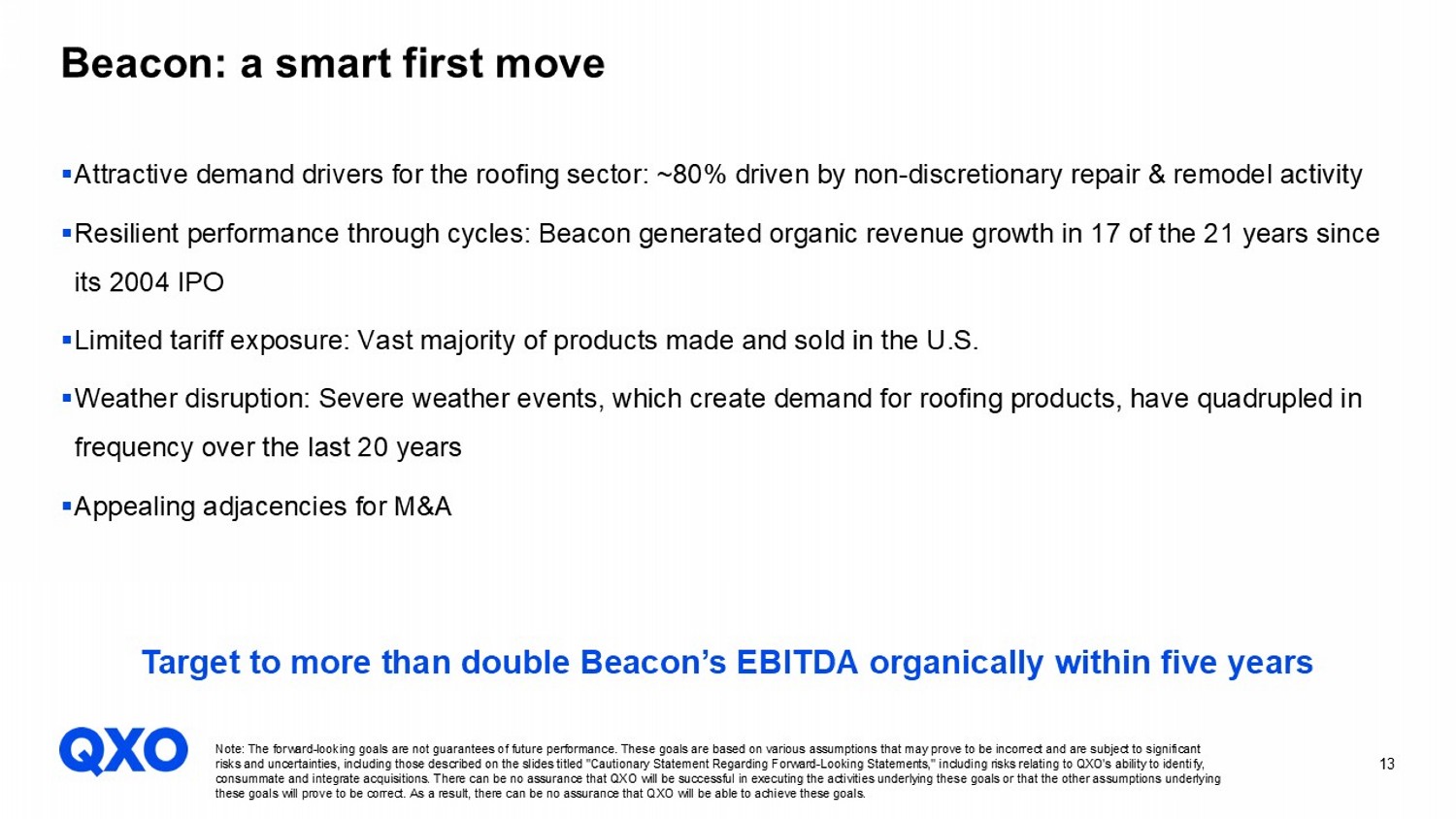 13 Beacon: a smart first move ▪ Attractive demand drivers for the roofing sector: ~80% driven by non - discretionary repair & remodel activity ▪ Resilient performance through cycles: Beacon generated organic revenue growth in 17 of the 21 years since its 2004 IPO ▪ Limited tariff exposure: Vast majority of products made and sold in the U.S. ▪ Weather disruption: Severe weather events, which create demand for roofing products, have quadrupled in frequency over the last 20 years ▪ Appealing adjacencies for M&A Target to more than double Beacon’s EBITDA organically within five years Note: The forward - looking goals are not guarantees of future performance. These goals are based on various assumptions that may prove to be incorrect and are subject to significant risks and uncertainties, including those described on the slides titled "Cautionary Statement Regarding Forward - Looking Statemen ts," including risks relating to QXO's ability to identify, consummate and integrate acquisitions. There can be no assurance that QXO will be successful in executing the activities unde rly ing these goals or that the other assumptions underlying these goals will prove to be correct. As a result, there can be no assurance that QXO will be able to achieve these goals.