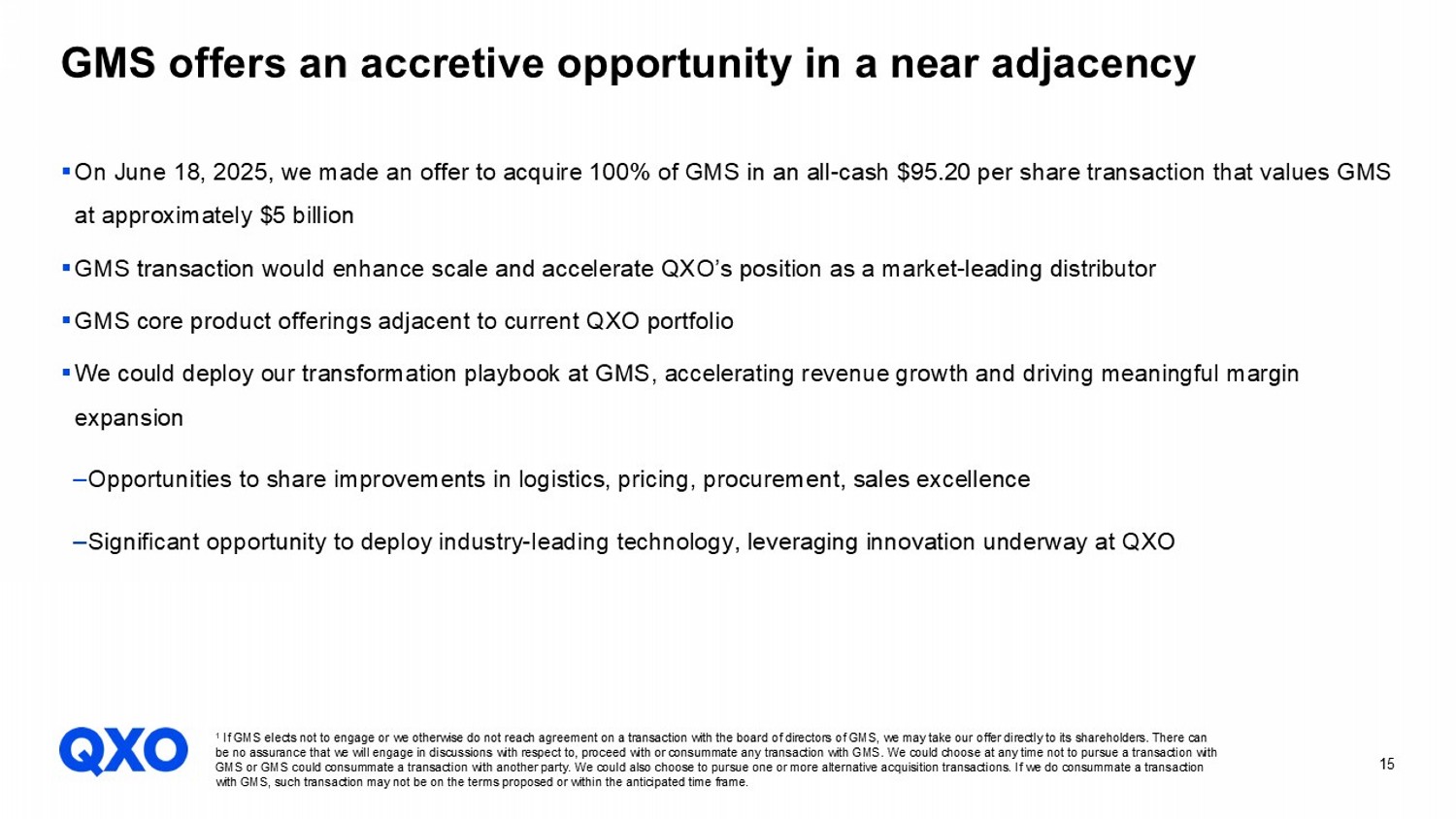 15 GMS offers an accretive opportunity in a near adjacency ▪ On June 18, 2025, we made an offer to acquire 100% of GMS in an all - cash $95.20 per share transaction that values GMS at approximately $5 billion ▪ GMS transaction would enhance scale and accelerate QXO’s position as a market - leading distributor ▪ GMS core product offerings adjacent to current QXO portfolio ▪ We could deploy our transformation playbook at GMS, accelerating revenue growth and driving meaningful margin expansion ‒ Opportunities to share improvements in logistics, pricing, procurement, sales excellence ‒ Significant opportunity to deploy industry - leading technology, leveraging innovation underway at QXO 1 If GMS elects not to engage or we otherwise do not reach agreement on a transaction with the board of directors of GMS, we may take our offer directly to its shareholders. There can be no assurance that we will engage in discussions with respect to, proceed with or consummate any transaction with GMS. We c oul d choose at any time not to pursue a transaction with GMS or GMS could consummate a transaction with another party. We could also choose to pursue one or more alternative acquisit ion transactions. If we do consummate a transaction with GMS, such transaction may not be on the terms proposed or within the anticipated time frame.