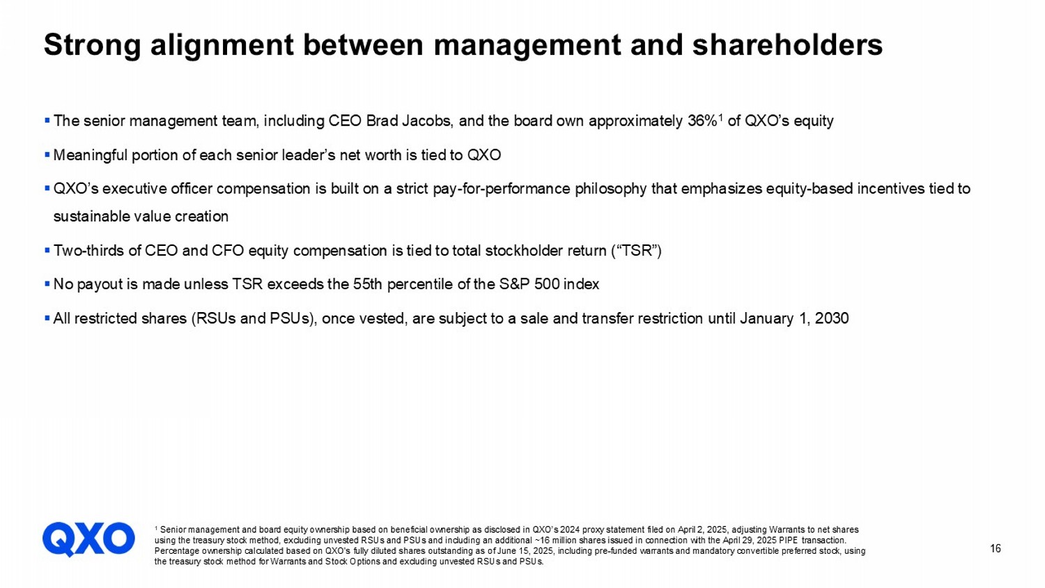 16 Strong alignment between management and shareholders ▪ The senior management team, including CEO Brad Jacobs, and the board own approximately 36% 1 of QXO’s equity ▪ Meaningful portion of each senior leader’s net worth is tied to QXO ▪ QXO’s executive officer compensation is built on a strict pay - for - performance philosophy that emphasizes equity - based incentives tied to sustainable value creation ▪ Two - thirds of CEO and CFO equity compensation is tied to total stockholder return (“TSR”) ▪ No payout is made unless TSR exceeds the 55th percentile of the S&P 500 index ▪ All restricted shares (RSUs and PSUs), once vested, are subject to a sale and transfer restriction until January 1, 2030 1 Senior management and board equity ownership based on beneficial ownership as disclosed in QXO’s 2024 proxy statement filed o n April 2, 2025, adjusting Warrants to net shares using the treasury stock method, excluding unvested RSUs and PSUs and including an additional ~16 million shares issued in co nne ction with the April 29, 2025 PIPE transaction. Percentage ownership calculated based on QXO's fully diluted shares outstanding as of June 15, 2025, including pre - funded warran ts and mandatory convertible preferred stock, using the treasury stock method for Warrants and Stock Options and excluding unvested RSUs and PSUs.