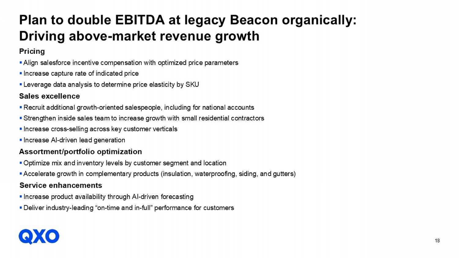 18 Pricing ▪ Align salesforce incentive compensation with optimized price parameters ▪ Increase capture rate of indicated price ▪ Leverage data analysis to determine price elasticity by SKU Sales excellence ▪ Recruit additional growth - oriented salespeople, including for national accounts ▪ Strengthen inside sales team to increase growth with small residential contractors ▪ Increase cross - selling across key customer verticals ▪ Increase AI - driven lead generation Assortment/portfolio optimization ▪ Optimize mix and inventory levels by customer segment and location ▪ Accelerate growth in complementary products (insulation, waterproofing, siding, and gutters) Service enhancements ▪ Increase product availability through AI - driven forecasting ▪ Deliver industry - leading “on - time and in - full” performance for customers Plan to double EBITDA at legacy Beacon organically: Driving above - market revenue growth