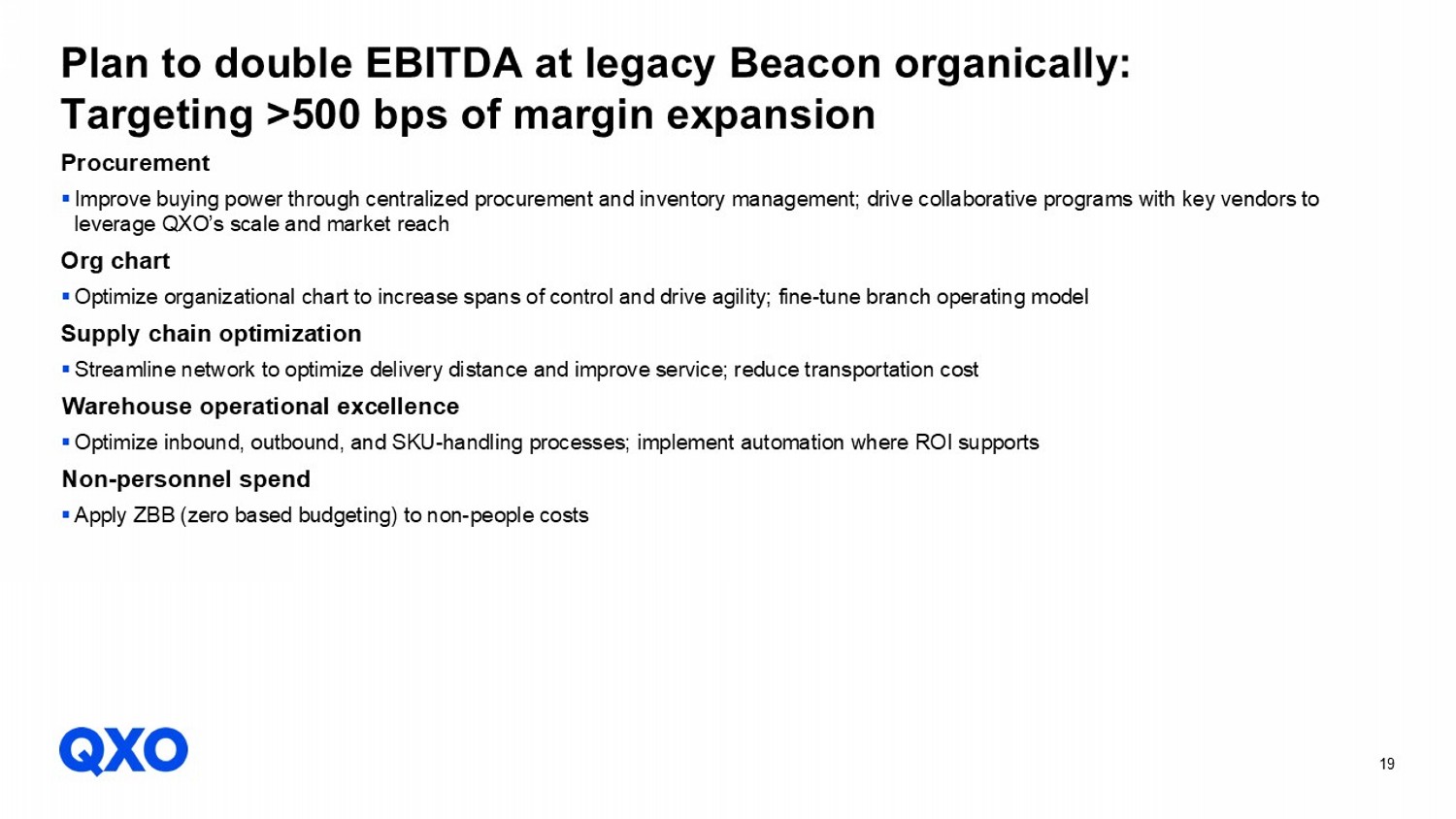 19 Procurement ▪ Improve buying power through centralized procurement and inventory management; drive collaborative programs with key vendors to leverage QXO’s scale and market reach Org chart ▪ Optimize organizational chart to increase spans of control and drive agility; fine - tune branch operating model Supply chain optimization ▪ Streamline network to optimize delivery distance and improve service; reduce transportation cost Warehouse operational excellence ▪ Optimize inbound, outbound, and SKU - handling processes; implement automation where ROI supports Non - personnel spend ▪ Apply ZBB (zero based budgeting) to non - people costs Plan to double EBITDA at legacy Beacon organically: Targeting >500 bps of margin expansion
