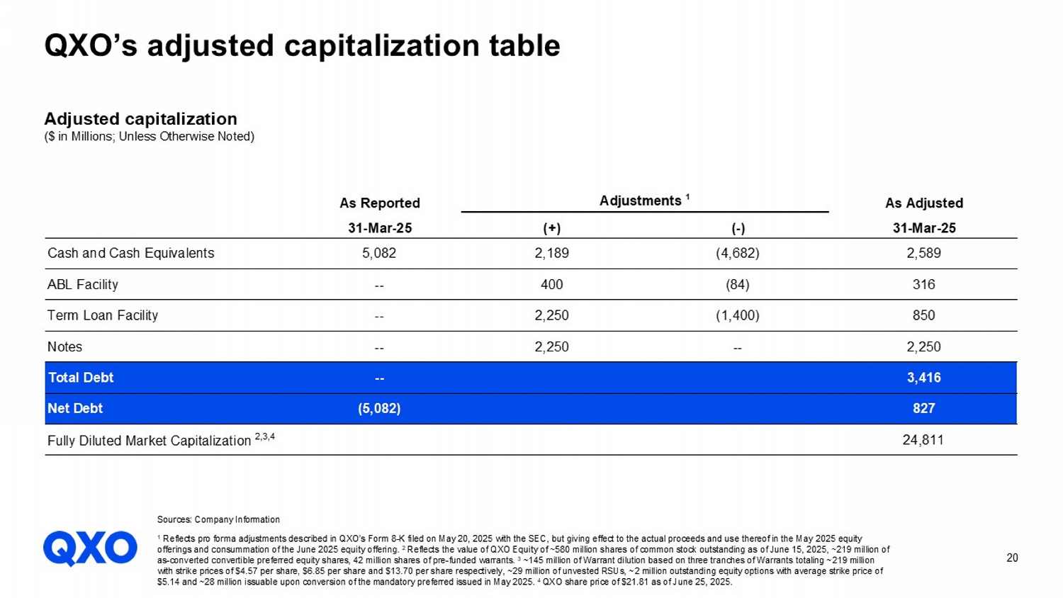20 As Reported Adjustments 1 As Adjusted 31-Mar-25 (+) (-) 31-Mar-25 Cash and Cash Equivalents 5,082 2,189 (4,682) 2,589 ABL Facility -- 400 (84) 316 Term Loan Facility -- 2,250 (1,400) 850 Notes -- 2,250 -- 2,250 Total Debt -- 3,416 Net Debt (5,082) 827 Fully Diluted Market Capitalization 2,3,4 24,811 QXO’s adjusted capitalization table Adjusted capitalization ($ in Millions; Unless Otherwise Noted) Sources: Company Information 1 Reflects pro forma adjustments described in QXO’s Form 8 - K filed on May 20, 2025 with the SEC, but giving effect to the actual proceeds and use thereof in the May 2025 equity offerings and consummation of the June 2025 equity offering. 2 Reflects the value of QXO Equity of ~580 million shares of common stock outstanding as of June 15, 2025, ~219 million of as - converted convertible preferred equity shares, 42 million shares of pre - funded warrants. 3 ~145 million of Warrant dilution based on three tranches of Warrants totaling ~219 million with strike prices of $4.57 per share, $6.85 per share and $13.70 per share respectively, ~29 million of unvested RSUs, ~2 mi lli on outstanding equity options with average strike price of $5.14 and ~28 million issuable upon conversion of the mandatory preferred issued in May 2025. 4 QXO share price of $21.81 as of June 25, 2025 .