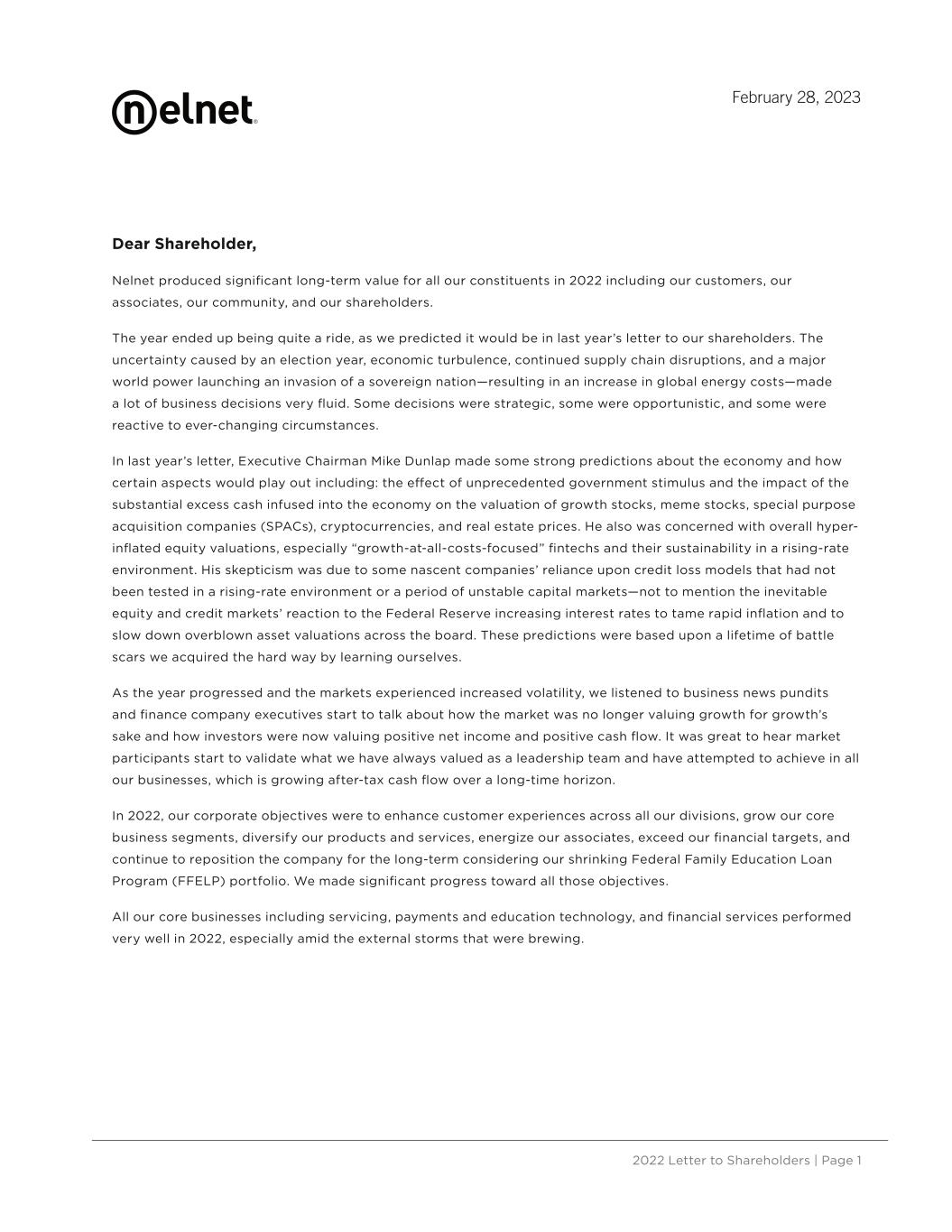 2022 Letter to Shareholders | Page 1 Dear Shareholder, Nelnet produced significant long-term value for all our constituents in 2022 including our customers, our associates, our community, and our shareholders. The year ended up being quite a ride, as we predicted it would be in last year’s letter to our shareholders. The uncertainty caused by an election year, economic turbulence, continued supply chain disruptions, and a major world power launching an invasion of a sovereign nation—resulting in an increase in global energy costs—made a lot of business decisions very fluid. Some decisions were strategic, some were opportunistic, and some were reactive to ever-changing circumstances. In last year’s letter, Executive Chairman Mike Dunlap made some strong predictions about the economy and how certain aspects would play out including: the effect of unprecedented government stimulus and the impact of the substantial excess cash infused into the economy on the valuation of growth stocks, meme stocks, special purpose acquisition companies (SPACs), cryptocurrencies, and real estate prices. He also was concerned with overall hyper- inflated equity valuations, especially “growth-at-all-costs-focused” fintechs and their sustainability in a rising-rate environment. His skepticism was due to some nascent companies’ reliance upon credit loss models that had not been tested in a rising-rate environment or a period of unstable capital markets—not to mention the inevitable equity and credit markets’ reaction to the Federal Reserve increasing interest rates to tame rapid inflation and to slow down overblown asset valuations across the board. These predictions were based upon a lifetime of battle scars we acquired the hard way by learning ourselves. As the year progressed and the markets experienced increased volatility, we listened to business news pundits and finance company executives start to talk about how the market was no longer valuing growth for growth’s sake and how investors were now valuing positive net income and positive cash flow. It was great to hear market participants start to validate what we have always valued as a leadership team and have attempted to achieve in all our businesses, which is growing after-tax cash flow over a long-time horizon. In 2022, our corporate objectives were to enhance customer experiences across all our divisions, grow our core business segments, diversify our products and services, energize our associates, exceed our financial targets, and continue to reposition the company for the long-term considering our shrinking Federal Family Education Loan Program (FFELP) portfolio. We made significant progress toward all those objectives. All our core businesses including servicing, payments and education technology, and financial services performed very well in 2022, especially amid the external storms that were brewing. February 28, 2023
