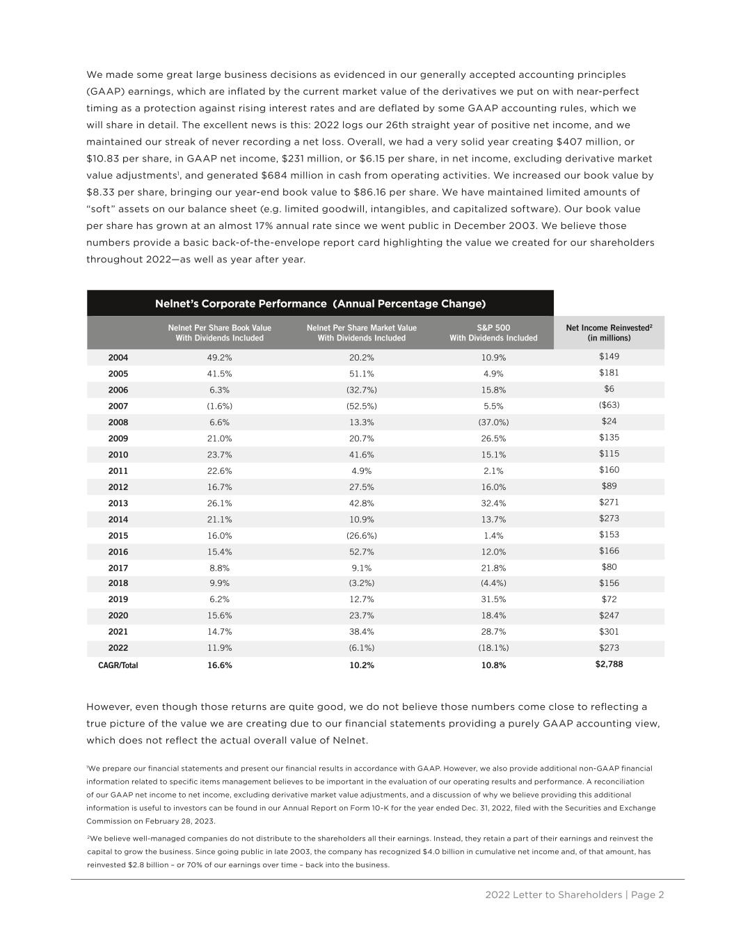 2022 Letter to Shareholders | Page 2 We made some great large business decisions as evidenced in our generally accepted accounting principles (GAAP) earnings, which are inflated by the current market value of the derivatives we put on with near-perfect timing as a protection against rising interest rates and are deflated by some GAAP accounting rules, which we will share in detail. The excellent news is this: 2022 logs our 26th straight year of positive net income, and we maintained our streak of never recording a net loss. Overall, we had a very solid year creating $407 million, or $10.83 per share, in GAAP net income, $231 million, or $6.15 per share, in net income, excluding derivative market value adjustments1, and generated $684 million in cash from operating activities. We increased our book value by $8.33 per share, bringing our year-end book value to $86.16 per share. We have maintained limited amounts of “soft” assets on our balance sheet (e.g. limited goodwill, intangibles, and capitalized software). Our book value per share has grown at an almost 17% annual rate since we went public in December 2003. We believe those numbers provide a basic back-of-the-envelope report card highlighting the value we created for our shareholders throughout 2022—as well as year after year. However, even though those returns are quite good, we do not believe those numbers come close to reflecting a true picture of the value we are creating due to our financial statements providing a purely GAAP accounting view, which does not reflect the actual overall value of Nelnet. 1We prepare our financial statements and present our financial results in accordance with GAAP. However, we also provide additional non-GAAP financial information related to specific items management believes to be important in the evaluation of our operating results and performance. A reconciliation of our GAAP net income to net income, excluding derivative market value adjustments, and a discussion of why we believe providing this additional information is useful to investors can be found in our Annual Report on Form 10-K for the year ended Dec. 31, 2022, filed with the Securities and Exchange Commission on February 28, 2023. Nelnet’s Corporate Performance (Annual Percentage Change) Nelnet Per Share Book Value With Dividends Included Nelnet Per Share Market Value With Dividends Included S&P 500 With Dividends Included Net Income Reinvested2 (in millions) 2004 49.2% 20.2% 10.9% $149 2005 41.5% 51.1% 4.9% $181 2006 6.3% (32.7%) 15.8% $6 2007 (1.6%) (52.5%) 5.5% ($63) 2008 6.6% 13.3% (37.0%) $24 2009 21.0% 20.7% 26.5% $135 2010 23.7% 41.6% 15.1% $115 2011 22.6% 4.9% 2.1% $160 2012 16.7% 27.5% 16.0% $89 2013 26.1% 42.8% 32.4% $271 2014 21.1% 10.9% 13.7% $273 2015 16.0% (26.6%) 1.4% $153 2016 15.4% 52.7% 12.0% $166 2017 8.8% 9.1% 21.8% $80 2018 9.9% (3.2%) (4.4%) $156 2019 6.2% 12.7% 31.5% $72 2020 15.6% 23.7% 18.4% $247 2021 14.7% 38.4% 28.7% $301 2022 11.9% (6.1%) (18.1%) $273 CAGR/Total 16.6% 10.2% 10.8% $2,788 2We believe well-managed companies do not distribute to the shareholders all their earnings. Instead, they retain a part of their earnings and reinvest the capital to grow the business. Since going public in late 2003, the company has recognized $4.0 billion in cumulative net income and, of that amount, has reinvested $2.8 billion – or 70% of our earnings over time – back into the business.