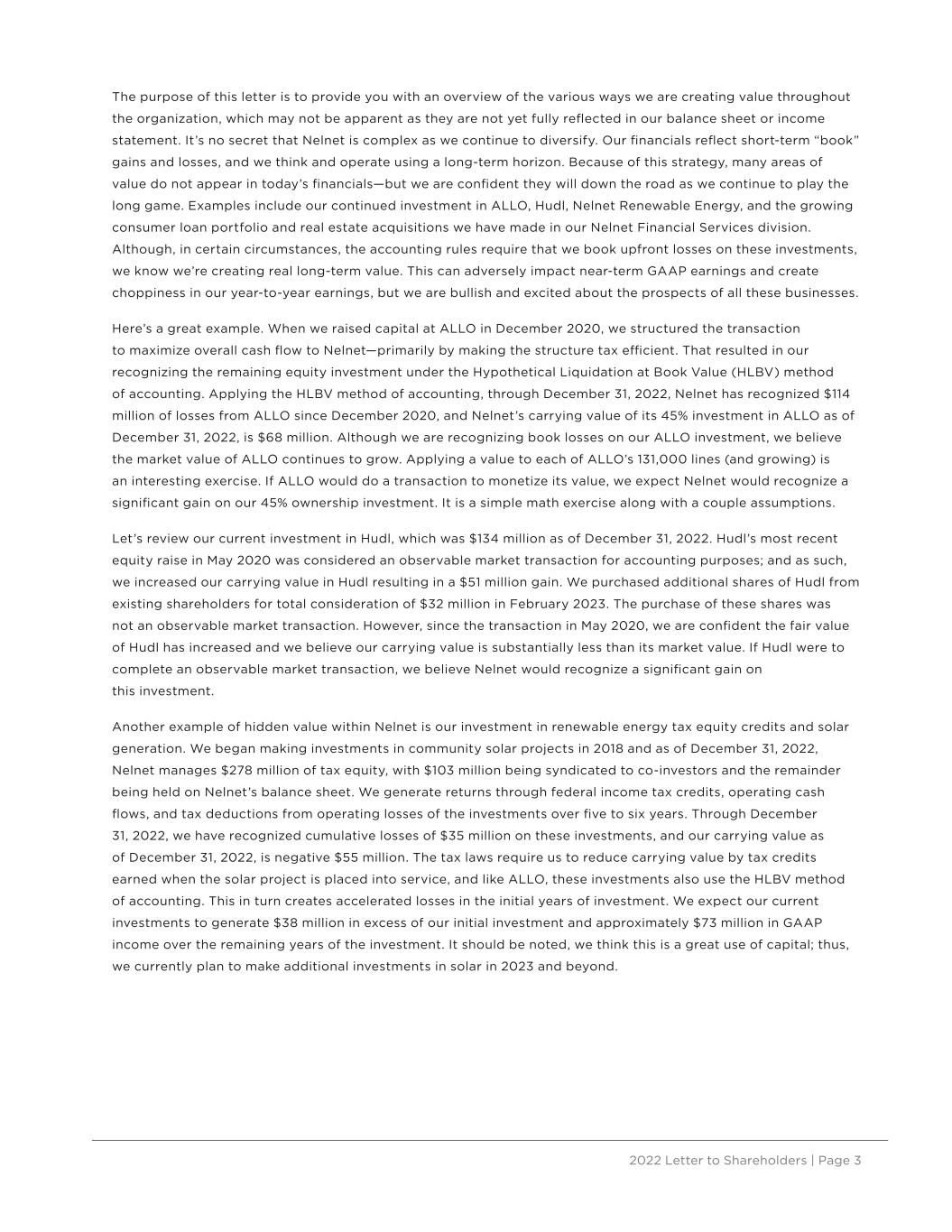 2022 Letter to Shareholders | Page 3 The purpose of this letter is to provide you with an overview of the various ways we are creating value throughout the organization, which may not be apparent as they are not yet fully reflected in our balance sheet or income statement. It’s no secret that Nelnet is complex as we continue to diversify. Our financials reflect short-term “book” gains and losses, and we think and operate using a long-term horizon. Because of this strategy, many areas of value do not appear in today’s financials—but we are confident they will down the road as we continue to play the long game. Examples include our continued investment in ALLO, Hudl, Nelnet Renewable Energy, and the growing consumer loan portfolio and real estate acquisitions we have made in our Nelnet Financial Services division. Although, in certain circumstances, the accounting rules require that we book upfront losses on these investments, we know we’re creating real long-term value. This can adversely impact near-term GAAP earnings and create choppiness in our year-to-year earnings, but we are bullish and excited about the prospects of all these businesses. Here’s a great example. When we raised capital at ALLO in December 2020, we structured the transaction to maximize overall cash flow to Nelnet—primarily by making the structure tax efficient. That resulted in our recognizing the remaining equity investment under the Hypothetical Liquidation at Book Value (HLBV) method of accounting. Applying the HLBV method of accounting, through December 31, 2022, Nelnet has recognized $114 million of losses from ALLO since December 2020, and Nelnet’s carrying value of its 45% investment in ALLO as of December 31, 2022, is $68 million. Although we are recognizing book losses on our ALLO investment, we believe the market value of ALLO continues to grow. Applying a value to each of ALLO’s 131,000 lines (and growing) is an interesting exercise. If ALLO would do a transaction to monetize its value, we expect Nelnet would recognize a significant gain on our 45% ownership investment. It is a simple math exercise along with a couple assumptions. Let’s review our current investment in Hudl, which was $134 million as of December 31, 2022. Hudl’s most recent equity raise in May 2020 was considered an observable market transaction for accounting purposes; and as such, we increased our carrying value in Hudl resulting in a $51 million gain. We purchased additional shares of Hudl from existing shareholders for total consideration of $32 million in February 2023. The purchase of these shares was not an observable market transaction. However, since the transaction in May 2020, we are confident the fair value of Hudl has increased and we believe our carrying value is substantially less than its market value. If Hudl were to complete an observable market transaction, we believe Nelnet would recognize a significant gain on this investment. Another example of hidden value within Nelnet is our investment in renewable energy tax equity credits and solar generation. We began making investments in community solar projects in 2018 and as of December 31, 2022, Nelnet manages $278 million of tax equity, with $103 million being syndicated to co-investors and the remainder being held on Nelnet’s balance sheet. We generate returns through federal income tax credits, operating cash flows, and tax deductions from operating losses of the investments over five to six years. Through December 31, 2022, we have recognized cumulative losses of $35 million on these investments, and our carrying value as of December 31, 2022, is negative $55 million. The tax laws require us to reduce carrying value by tax credits earned when the solar project is placed into service, and like ALLO, these investments also use the HLBV method of accounting. This in turn creates accelerated losses in the initial years of investment. We expect our current investments to generate $38 million in excess of our initial investment and approximately $73 million in GAAP income over the remaining years of the investment. It should be noted, we think this is a great use of capital; thus, we currently plan to make additional investments in solar in 2023 and beyond.