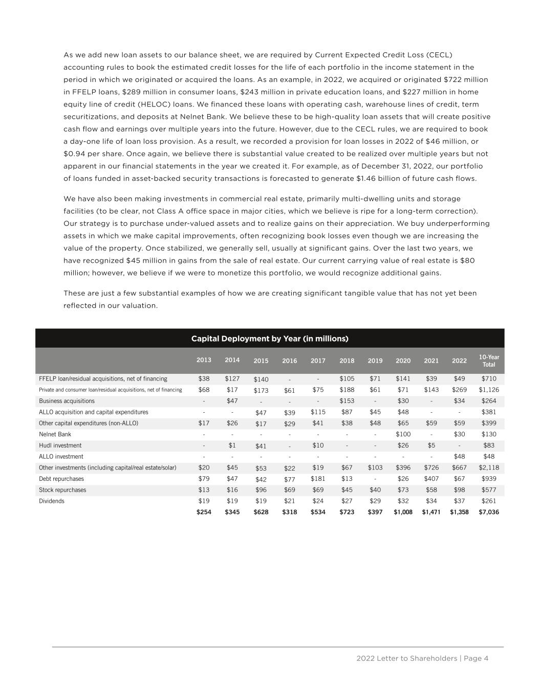 2022 Letter to Shareholders | Page 4 As we add new loan assets to our balance sheet, we are required by Current Expected Credit Loss (CECL) accounting rules to book the estimated credit losses for the life of each portfolio in the income statement in the period in which we originated or acquired the loans. As an example, in 2022, we acquired or originated $722 million in FFELP loans, $289 million in consumer loans, $243 million in private education loans, and $227 million in home equity line of credit (HELOC) loans. We financed these loans with operating cash, warehouse lines of credit, term securitizations, and deposits at Nelnet Bank. We believe these to be high-quality loan assets that will create positive cash flow and earnings over multiple years into the future. However, due to the CECL rules, we are required to book a day-one life of loan loss provision. As a result, we recorded a provision for loan losses in 2022 of $46 million, or $0.94 per share. Once again, we believe there is substantial value created to be realized over multiple years but not apparent in our financial statements in the year we created it. For example, as of December 31, 2022, our portfolio of loans funded in asset-backed security transactions is forecasted to generate $1.46 billion of future cash flows. We have also been making investments in commercial real estate, primarily multi-dwelling units and storage facilities (to be clear, not Class A office space in major cities, which we believe is ripe for a long-term correction). Our strategy is to purchase under-valued assets and to realize gains on their appreciation. We buy underperforming assets in which we make capital improvements, often recognizing book losses even though we are increasing the value of the property. Once stabilized, we generally sell, usually at significant gains. Over the last two years, we have recognized $45 million in gains from the sale of real estate. Our current carrying value of real estate is $80 million; however, we believe if we were to monetize this portfolio, we would recognize additional gains. These are just a few substantial examples of how we are creating significant tangible value that has not yet been reflected in our valuation. Capital Deployment by Year (in millions) 2013 2014 2015 2016 2017 2018 2019 2020 2021 2022 10-Year Total FFELP loan/residual acquisitions, net of financing $38 $127 $140 - - $105 $71 $141 $39 $49 $710 Private and consumer loan/residual acquisitions, net of financing $68 $17 $173 $61 $75 $188 $61 $71 $143 $269 $1,126 Business acquisitions - $47 - - - $153 - $30 - $34 $264 ALLO acquisition and capital expenditures - - $47 $39 $115 $87 $45 $48 - - $381 Other capital expenditures (non-ALLO) $17 $26 $17 $29 $41 $38 $48 $65 $59 $59 $399 Nelnet Bank - - - - - - - $100 - $30 $130 Hudl investment - $1 $41 - $10 - - $26 $5 - $83 ALLO investment - - - - - - - - - $48 $48 Other investments (including capital/real estate/solar) $20 $45 $53 $22 $19 $67 $103 $396 $726 $667 $2,118 Debt repurchases $79 $47 $42 $77 $181 $13 - $26 $407 $67 $939 Stock repurchases $13 $16 $96 $69 $69 $45 $40 $73 $58 $98 $577 Dividends $19 $19 $19 $21 $24 $27 $29 $32 $34 $37 $261 $254 $345 $628 $318 $534 $723 $397 $1,008 $1,471 $1,358 $7,036