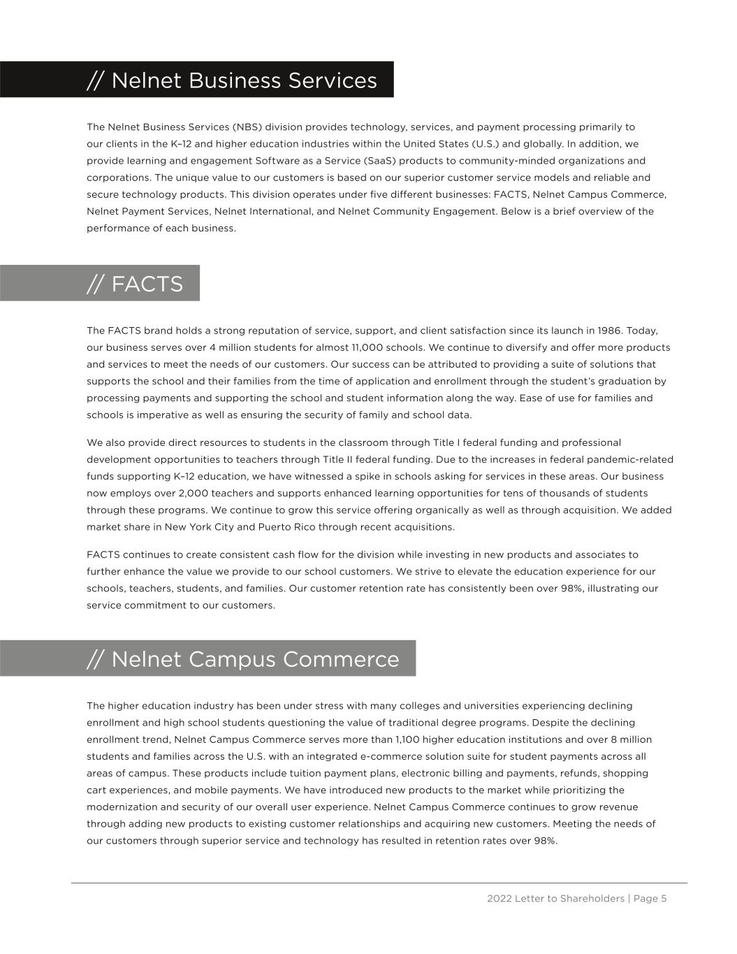 2022 Letter to Shareholders | Page 5 // Nelnet Business Services The Nelnet Business Services (NBS) division provides technology, services, and payment processing primarily to our clients in the K–12 and higher education industries within the United States (U.S.) and globally. In addition, we provide learning and engagement Software as a Service (SaaS) products to community-minded organizations and corporations. The unique value to our customers is based on our superior customer service models and reliable and secure technology products. This division operates under five different businesses: FACTS, Nelnet Campus Commerce, Nelnet Payment Services, Nelnet International, and Nelnet Community Engagement. Below is a brief overview of the performance of each business. // FACTS The FACTS brand holds a strong reputation of service, support, and client satisfaction since its launch in 1986. Today, our business serves over 4 million students for almost 11,000 schools. We continue to diversify and offer more products and services to meet the needs of our customers. Our success can be attributed to providing a suite of solutions that supports the school and their families from the time of application and enrollment through the student’s graduation by processing payments and supporting the school and student information along the way. Ease of use for families and schools is imperative as well as ensuring the security of family and school data. We also provide direct resources to students in the classroom through Title I federal funding and professional development opportunities to teachers through Title II federal funding. Due to the increases in federal pandemic-related funds supporting K–12 education, we have witnessed a spike in schools asking for services in these areas. Our business now employs over 2,000 teachers and supports enhanced learning opportunities for tens of thousands of students through these programs. We continue to grow this service offering organically as well as through acquisition. We added market share in New York City and Puerto Rico through recent acquisitions. FACTS continues to create consistent cash flow for the division while investing in new products and associates to further enhance the value we provide to our school customers. We strive to elevate the education experience for our schools, teachers, students, and families. Our customer retention rate has consistently been over 98%, illustrating our service commitment to our customers. // Nelnet Campus Commerce The higher education industry has been under stress with many colleges and universities experiencing declining enrollment and high school students questioning the value of traditional degree programs. Despite the declining enrollment trend, Nelnet Campus Commerce serves more than 1,100 higher education institutions and over 8 million students and families across the U.S. with an integrated e-commerce solution suite for student payments across all areas of campus. These products include tuition payment plans, electronic billing and payments, refunds, shopping cart experiences, and mobile payments. We have introduced new products to the market while prioritizing the modernization and security of our overall user experience. Nelnet Campus Commerce continues to grow revenue through adding new products to existing customer relationships and acquiring new customers. Meeting the needs of our customers through superior service and technology has resulted in retention rates over 98%.