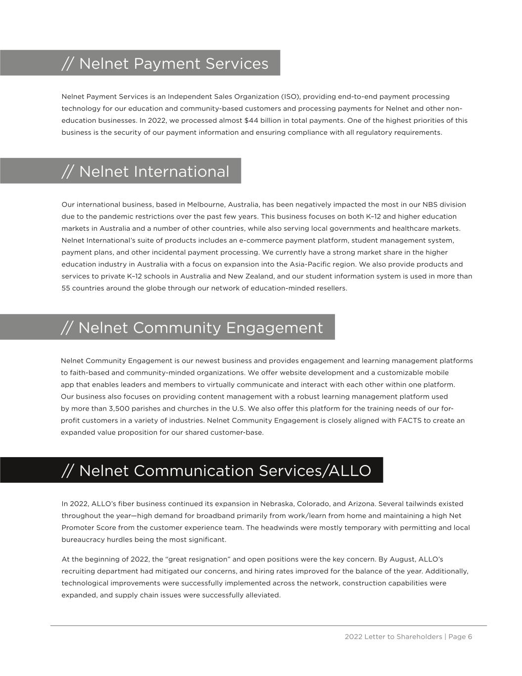 2022 Letter to Shareholders | Page 6 // Nelnet Payment Services Nelnet Payment Services is an Independent Sales Organization (ISO), providing end-to-end payment processing technology for our education and community-based customers and processing payments for Nelnet and other non- education businesses. In 2022, we processed almost $44 billion in total payments. One of the highest priorities of this business is the security of our payment information and ensuring compliance with all regulatory requirements. // Nelnet International Our international business, based in Melbourne, Australia, has been negatively impacted the most in our NBS division due to the pandemic restrictions over the past few years. This business focuses on both K–12 and higher education markets in Australia and a number of other countries, while also serving local governments and healthcare markets. Nelnet International’s suite of products includes an e-commerce payment platform, student management system, payment plans, and other incidental payment processing. We currently have a strong market share in the higher education industry in Australia with a focus on expansion into the Asia-Pacific region. We also provide products and services to private K–12 schools in Australia and New Zealand, and our student information system is used in more than 55 countries around the globe through our network of education-minded resellers. // Nelnet Community Engagement Nelnet Community Engagement is our newest business and provides engagement and learning management platforms to faith-based and community-minded organizations. We offer website development and a customizable mobile app that enables leaders and members to virtually communicate and interact with each other within one platform. Our business also focuses on providing content management with a robust learning management platform used by more than 3,500 parishes and churches in the U.S. We also offer this platform for the training needs of our for- profit customers in a variety of industries. Nelnet Community Engagement is closely aligned with FACTS to create an expanded value proposition for our shared customer-base. // Nelnet Communication Services/ALLO In 2022, ALLO’s fiber business continued its expansion in Nebraska, Colorado, and Arizona. Several tailwinds existed throughout the year—high demand for broadband primarily from work/learn from home and maintaining a high Net Promoter Score from the customer experience team. The headwinds were mostly temporary with permitting and local bureaucracy hurdles being the most significant. At the beginning of 2022, the “great resignation” and open positions were the key concern. By August, ALLO’s recruiting department had mitigated our concerns, and hiring rates improved for the balance of the year. Additionally, technological improvements were successfully implemented across the network, construction capabilities were expanded, and supply chain issues were successfully alleviated.