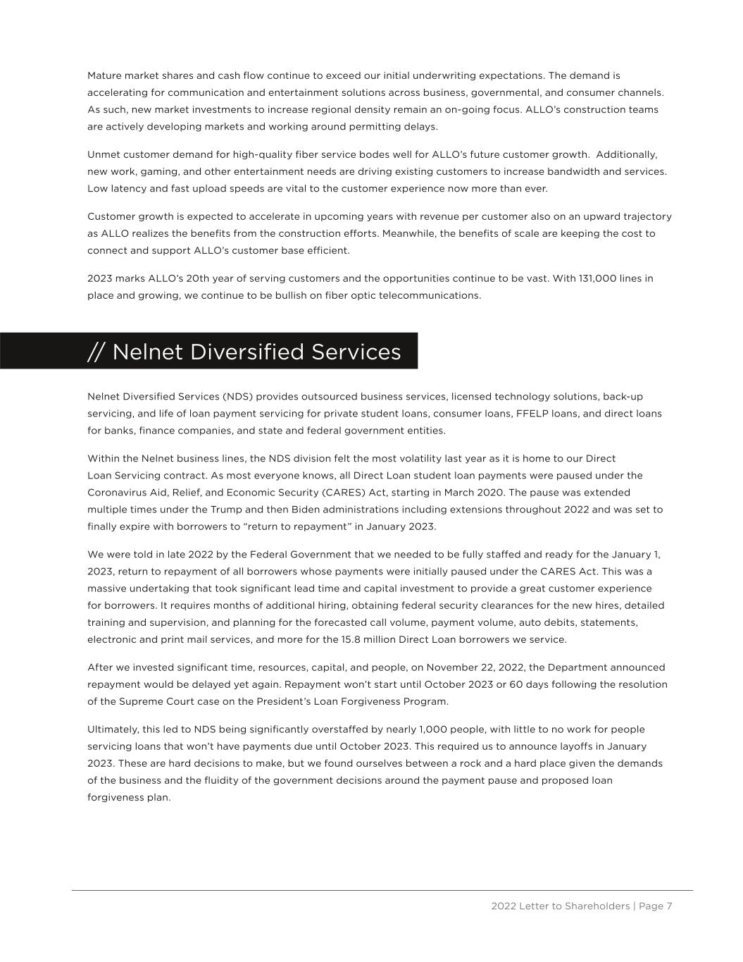 2022 Letter to Shareholders | Page 7 // Nelnet Diversified Services Nelnet Diversified Services (NDS) provides outsourced business services, licensed technology solutions, back-up servicing, and life of loan payment servicing for private student loans, consumer loans, FFELP loans, and direct loans for banks, finance companies, and state and federal government entities. Within the Nelnet business lines, the NDS division felt the most volatility last year as it is home to our Direct Loan Servicing contract. As most everyone knows, all Direct Loan student loan payments were paused under the Coronavirus Aid, Relief, and Economic Security (CARES) Act, starting in March 2020. The pause was extended multiple times under the Trump and then Biden administrations including extensions throughout 2022 and was set to finally expire with borrowers to “return to repayment” in January 2023. We were told in late 2022 by the Federal Government that we needed to be fully staffed and ready for the January 1, 2023, return to repayment of all borrowers whose payments were initially paused under the CARES Act. This was a massive undertaking that took significant lead time and capital investment to provide a great customer experience for borrowers. It requires months of additional hiring, obtaining federal security clearances for the new hires, detailed training and supervision, and planning for the forecasted call volume, payment volume, auto debits, statements, electronic and print mail services, and more for the 15.8 million Direct Loan borrowers we service. After we invested significant time, resources, capital, and people, on November 22, 2022, the Department announced repayment would be delayed yet again. Repayment won’t start until October 2023 or 60 days following the resolution of the Supreme Court case on the President’s Loan Forgiveness Program. Ultimately, this led to NDS being significantly overstaffed by nearly 1,000 people, with little to no work for people servicing loans that won’t have payments due until October 2023. This required us to announce layoffs in January 2023. These are hard decisions to make, but we found ourselves between a rock and a hard place given the demands of the business and the fluidity of the government decisions around the payment pause and proposed loan forgiveness plan. Mature market shares and cash flow continue to exceed our initial underwriting expectations. The demand is accelerating for communication and entertainment solutions across business, governmental, and consumer channels. As such, new market investments to increase regional density remain an on-going focus. ALLO’s construction teams are actively developing markets and working around permitting delays. Unmet customer demand for high-quality fiber service bodes well for ALLO’s future customer growth. Additionally, new work, gaming, and other entertainment needs are driving existing customers to increase bandwidth and services. Low latency and fast upload speeds are vital to the customer experience now more than ever. Customer growth is expected to accelerate in upcoming years with revenue per customer also on an upward trajectory as ALLO realizes the benefits from the construction efforts. Meanwhile, the benefits of scale are keeping the cost to connect and support ALLO’s customer base efficient. 2023 marks ALLO’s 20th year of serving customers and the opportunities continue to be vast. With 131,000 lines in place and growing, we continue to be bullish on fiber optic telecommunications.