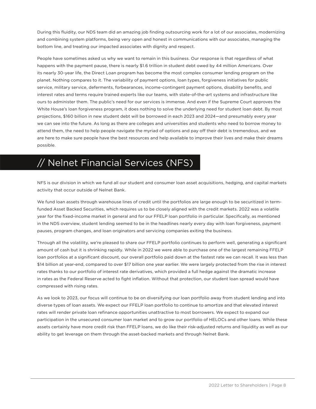 2022 Letter to Shareholders | Page 8 During this fluidity, our NDS team did an amazing job finding outsourcing work for a lot of our associates, modernizing and combining system platforms, being very open and honest in communications with our associates, managing the bottom line, and treating our impacted associates with dignity and respect. People have sometimes asked us why we want to remain in this business. Our response is that regardless of what happens with the payment pause, there is nearly $1.6 trillion in student debt owed by 44 million Americans. Over its nearly 30-year life, the Direct Loan program has become the most complex consumer lending program on the planet. Nothing compares to it. The variability of payment options, loan types, forgiveness initiatives for public service, military service, deferments, forbearances, income-contingent payment options, disability benefits, and interest rates and terms require trained experts like our teams, with state-of-the-art systems and infrastructure like ours to administer them. The public’s need for our services is immense. And even if the Supreme Court approves the White House’s loan forgiveness program, it does nothing to solve the underlying need for student loan debt. By most projections, $160 billion in new student debt will be borrowed in each 2023 and 2024—and presumably every year we can see into the future. As long as there are colleges and universities and students who need to borrow money to attend them, the need to help people navigate the myriad of options and pay off their debt is tremendous, and we are here to make sure people have the best resources and help available to improve their lives and make their dreams possible. // Nelnet Financial Services (NFS) NFS is our division in which we fund all our student and consumer loan asset acquisitions, hedging, and capital markets activity that occur outside of Nelnet Bank. We fund loan assets through warehouse lines of credit until the portfolios are large enough to be securitized in term- funded Asset Backed Securities, which requires us to be closely aligned with the credit markets. 2022 was a volatile year for the fixed-income market in general and for our FFELP loan portfolio in particular. Specifically, as mentioned in the NDS overview, student lending seemed to be in the headlines nearly every day with loan forgiveness, payment pauses, program changes, and loan originators and servicing companies exiting the business. Through all the volatility, we’re pleased to share our FFELP portfolio continues to perform well, generating a significant amount of cash but it is shrinking rapidly. While in 2022 we were able to purchase one of the largest remaining FFELP loan portfolios at a significant discount, our overall portfolio paid down at the fastest rate we can recall. It was less than $14 billion at year-end, compared to over $17 billion one year earlier. We were largely protected from the rise in interest rates thanks to our portfolio of interest rate derivatives, which provided a full hedge against the dramatic increase in rates as the Federal Reserve acted to fight inflation. Without that protection, our student loan spread would have compressed with rising rates. As we look to 2023, our focus will continue to be on diversifying our loan portfolio away from student lending and into diverse types of loan assets. We expect our FFELP loan portfolio to continue to amortize and that elevated interest rates will render private loan refinance opportunities unattractive to most borrowers. We expect to expand our participation in the unsecured consumer loan market and to grow our portfolio of HELOCs and other loans. While these assets certainly have more credit risk than FFELP loans, we do like their risk-adjusted returns and liquidity as well as our ability to get leverage on them through the asset-backed markets and through Nelnet Bank.