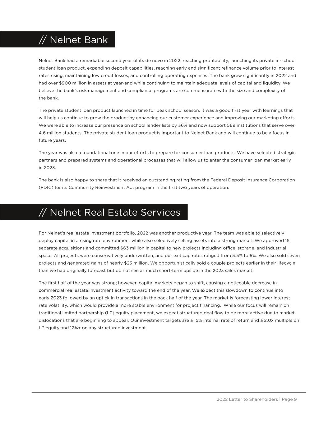 2022 Letter to Shareholders | Page 9 // Nelnet Bank Nelnet Bank had a remarkable second year of its de novo in 2022, reaching profitability, launching its private in-school student loan product, expanding deposit capabilities, reaching early and significant refinance volume prior to interest rates rising, maintaining low credit losses, and controlling operating expenses. The bank grew significantly in 2022 and had over $900 million in assets at year-end while continuing to maintain adequate levels of capital and liquidity. We believe the bank’s risk management and compliance programs are commensurate with the size and complexity of the bank. The private student loan product launched in time for peak school season. It was a good first year with learnings that will help us continue to grow the product by enhancing our customer experience and improving our marketing efforts. We were able to increase our presence on school lender lists by 36% and now support 569 institutions that serve over 4.6 million students. The private student loan product is important to Nelnet Bank and will continue to be a focus in future years. The year was also a foundational one in our efforts to prepare for consumer loan products. We have selected strategic partners and prepared systems and operational processes that will allow us to enter the consumer loan market early in 2023. The bank is also happy to share that it received an outstanding rating from the Federal Deposit Insurance Corporation (FDIC) for its Community Reinvestment Act program in the first two years of operation. // Nelnet Real Estate Services For Nelnet’s real estate investment portfolio, 2022 was another productive year. The team was able to selectively deploy capital in a rising rate environment while also selectively selling assets into a strong market. We approved 15 separate acquisitions and committed $63 million in capital to new projects including office, storage, and industrial space. All projects were conservatively underwritten, and our exit cap rates ranged from 5.5% to 6%. We also sold seven projects and generated gains of nearly $23 million. We opportunistically sold a couple projects earlier in their lifecycle than we had originally forecast but do not see as much short-term upside in the 2023 sales market. The first half of the year was strong; however, capital markets began to shift, causing a noticeable decrease in commercial real estate investment activity toward the end of the year. We expect this slowdown to continue into early 2023 followed by an uptick in transactions in the back half of the year. The market is forecasting lower interest rate volatility, which would provide a more stable environment for project financing. While our focus will remain on traditional limited partnership (LP) equity placement, we expect structured deal flow to be more active due to market dislocations that are beginning to appear. Our investment targets are a 15% internal rate of return and a 2.0x multiple on LP equity and 12%+ on any structured investment.