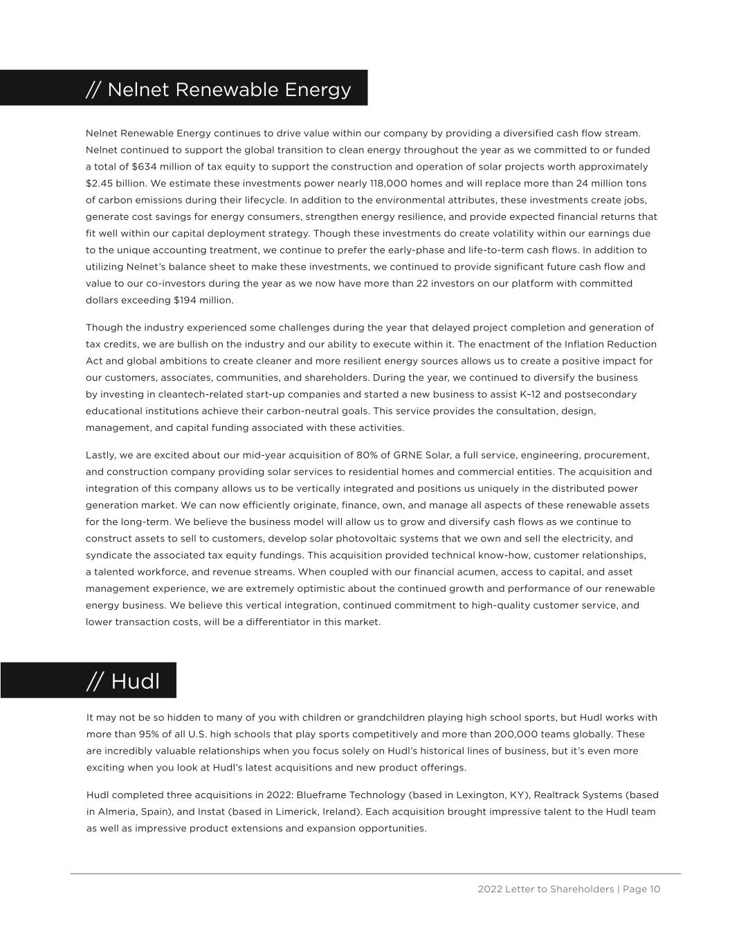 2022 Letter to Shareholders | Page 10 // Nelnet Renewable Energy Nelnet Renewable Energy continues to drive value within our company by providing a diversified cash flow stream. Nelnet continued to support the global transition to clean energy throughout the year as we committed to or funded a total of $634 million of tax equity to support the construction and operation of solar projects worth approximately $2.45 billion. We estimate these investments power nearly 118,000 homes and will replace more than 24 million tons of carbon emissions during their lifecycle. In addition to the environmental attributes, these investments create jobs, generate cost savings for energy consumers, strengthen energy resilience, and provide expected financial returns that fit well within our capital deployment strategy. Though these investments do create volatility within our earnings due to the unique accounting treatment, we continue to prefer the early-phase and life-to-term cash flows. In addition to utilizing Nelnet’s balance sheet to make these investments, we continued to provide significant future cash flow and value to our co-investors during the year as we now have more than 22 investors on our platform with committed dollars exceeding $194 million. Though the industry experienced some challenges during the year that delayed project completion and generation of tax credits, we are bullish on the industry and our ability to execute within it. The enactment of the Inflation Reduction Act and global ambitions to create cleaner and more resilient energy sources allows us to create a positive impact for our customers, associates, communities, and shareholders. During the year, we continued to diversify the business by investing in cleantech-related start-up companies and started a new business to assist K–12 and postsecondary educational institutions achieve their carbon-neutral goals. This service provides the consultation, design, management, and capital funding associated with these activities. Lastly, we are excited about our mid-year acquisition of 80% of GRNE Solar, a full service, engineering, procurement, and construction company providing solar services to residential homes and commercial entities. The acquisition and integration of this company allows us to be vertically integrated and positions us uniquely in the distributed power generation market. We can now efficiently originate, finance, own, and manage all aspects of these renewable assets for the long-term. We believe the business model will allow us to grow and diversify cash flows as we continue to construct assets to sell to customers, develop solar photovoltaic systems that we own and sell the electricity, and syndicate the associated tax equity fundings. This acquisition provided technical know-how, customer relationships, a talented workforce, and revenue streams. When coupled with our financial acumen, access to capital, and asset management experience, we are extremely optimistic about the continued growth and performance of our renewable energy business. We believe this vertical integration, continued commitment to high-quality customer service, and lower transaction costs, will be a differentiator in this market. It may not be so hidden to many of you with children or grandchildren playing high school sports, but Hudl works with more than 95% of all U.S. high schools that play sports competitively and more than 200,000 teams globally. These are incredibly valuable relationships when you focus solely on Hudl’s historical lines of business, but it’s even more exciting when you look at Hudl’s latest acquisitions and new product offerings. Hudl completed three acquisitions in 2022: Blueframe Technology (based in Lexington, KY), Realtrack Systems (based in Almeria, Spain), and Instat (based in Limerick, Ireland). Each acquisition brought impressive talent to the Hudl team as well as impressive product extensions and expansion opportunities. // Hudl