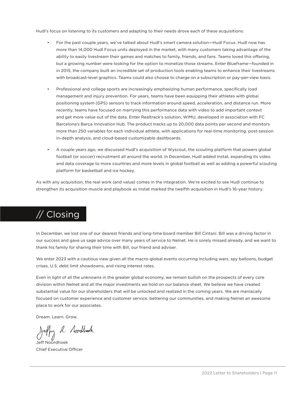 2022 Letter to Shareholders | Page 11 Hudl’s focus on listening to its customers and adapting to their needs drove each of these acquisitions: • For the past couple years, we’ve talked about Hudl’s smart camera solution—Hudl Focus. Hudl now has more than 14,000 Hudl Focus units deployed in the market, with many customers taking advantage of the ability to easily livestream their games and matches to family, friends, and fans. Teams loved this offering, but a growing number were looking for the option to monetize those streams. Enter Blueframe—founded in in 2015, the company built an incredible set of production tools enabling teams to enhance their livestreams with broadcast-level graphics. Teams could also choose to charge on a subscription or pay-per-view basis. • Professional and college sports are increasingly emphasizing human performance, specifically load management and injury prevention. For years, teams have been equipping their athletes with global positioning system (GPS) sensors to track information around speed, acceleration, and distance run. More recently, teams have focused on marrying this performance data with video to add important context and get more value out of the data. Enter Realtrack’s solution, WIMU, developed in association with FC Barcelona’s Barça Innovation Hub. The product tracks up to 20,000 data points per second and monitors more than 250 variables for each individual athlete, with applications for real-time monitoring, post-session in-depth analysis, and cloud-based customizable dashboards. • A couple years ago, we discussed Hudl’s acquisition of Wyscout, the scouting platform that powers global football (or soccer) recruitment all around the world. In December, Hudl added Instat, expanding its video and data coverage to more countries and more levels in global football as well as adding a powerful scouting platform for basketball and ice hockey. As with any acquisition, the real work (and value) comes in the integration. We’re excited to see Hudl continue to strengthen its acquisition muscle and playbook as Instat marked the twelfth acquisition in Hudl’s 16-year history. In December, we lost one of our dearest friends and long-time board member Bill Cintani. Bill was a driving factor in our success and gave us sage advice over many years of service to Nelnet. He is sorely missed already, and we want to thank his family for sharing their time with Bill, our friend and adviser. We enter 2023 with a cautious view given all the macro-global events occurring including wars, spy balloons, budget crises, U.S. debt limit showdowns, and rising interest rates. Even in light of all the unknowns in the greater global economy, we remain bullish on the prospects of every core division within Nelnet and all the major investments we hold on our balance sheet. We believe we have created substantial value for our shareholders that will be unlocked and realized in the coming years. We are maniacally focused on customer experience and customer service, bettering our communities, and making Nelnet an awesome place to work for our associates. Dream. Learn. Grow. Jeff Noordhoek Chief Executive Officer // Closing