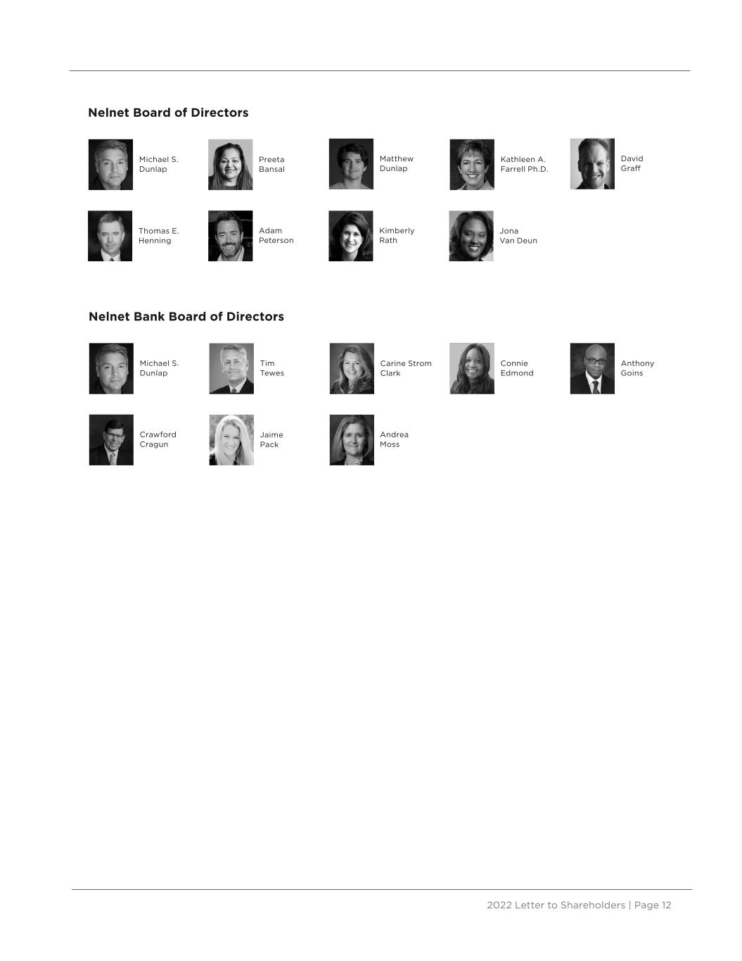 2022 Letter to Shareholders | Page 12 Matthew Dunlap Nelnet Board of Directors Michael S. Dunlap Preeta Bansal Kathleen A. Farrell Ph.D. David Graff Thomas E. Henning Kimberly Rath Nelnet Bank Board of Directors Michael S. Dunlap Tim Tewes Carine Strom Clark Connie Edmond Anthony Goins Crawford Cragun Jaime Pack Andrea Moss Adam Peterson Jona Van Deun