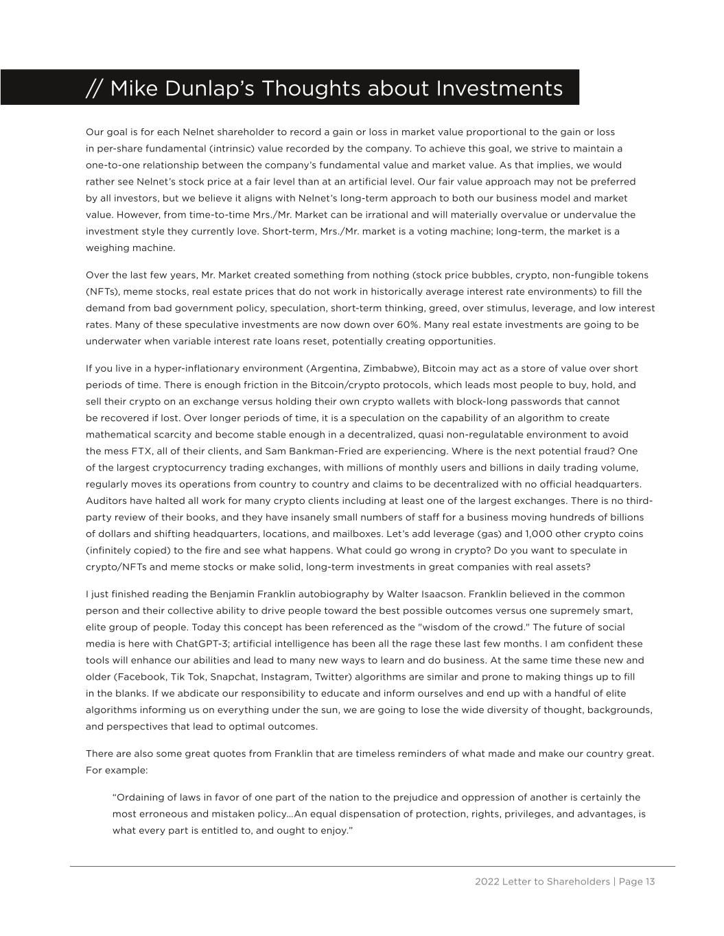 2022 Letter to Shareholders | Page 13 Our goal is for each Nelnet shareholder to record a gain or loss in market value proportional to the gain or loss in per-share fundamental (intrinsic) value recorded by the company. To achieve this goal, we strive to maintain a one-to-one relationship between the company’s fundamental value and market value. As that implies, we would rather see Nelnet’s stock price at a fair level than at an artificial level. Our fair value approach may not be preferred by all investors, but we believe it aligns with Nelnet’s long-term approach to both our business model and market value. However, from time-to-time Mrs./Mr. Market can be irrational and will materially overvalue or undervalue the investment style they currently love. Short-term, Mrs./Mr. market is a voting machine; long-term, the market is a weighing machine. Over the last few years, Mr. Market created something from nothing (stock price bubbles, crypto, non-fungible tokens (NFTs), meme stocks, real estate prices that do not work in historically average interest rate environments) to fill the demand from bad government policy, speculation, short-term thinking, greed, over stimulus, leverage, and low interest rates. Many of these speculative investments are now down over 60%. Many real estate investments are going to be underwater when variable interest rate loans reset, potentially creating opportunities. If you live in a hyper-inflationary environment (Argentina, Zimbabwe), Bitcoin may act as a store of value over short periods of time. There is enough friction in the Bitcoin/crypto protocols, which leads most people to buy, hold, and sell their crypto on an exchange versus holding their own crypto wallets with block-long passwords that cannot be recovered if lost. Over longer periods of time, it is a speculation on the capability of an algorithm to create mathematical scarcity and become stable enough in a decentralized, quasi non-regulatable environment to avoid the mess FTX, all of their clients, and Sam Bankman-Fried are experiencing. Where is the next potential fraud? One of the largest cryptocurrency trading exchanges, with millions of monthly users and billions in daily trading volume, regularly moves its operations from country to country and claims to be decentralized with no official headquarters. Auditors have halted all work for many crypto clients including at least one of the largest exchanges. There is no third- party review of their books, and they have insanely small numbers of staff for a business moving hundreds of billions of dollars and shifting headquarters, locations, and mailboxes. Let’s add leverage (gas) and 1,000 other crypto coins (infinitely copied) to the fire and see what happens. What could go wrong in crypto? Do you want to speculate in crypto/NFTs and meme stocks or make solid, long-term investments in great companies with real assets? I just finished reading the Benjamin Franklin autobiography by Walter Isaacson. Franklin believed in the common person and their collective ability to drive people toward the best possible outcomes versus one supremely smart, elite group of people. Today this concept has been referenced as the "wisdom of the crowd." The future of social media is here with ChatGPT-3; artificial intelligence has been all the rage these last few months. I am confident these tools will enhance our abilities and lead to many new ways to learn and do business. At the same time these new and older (Facebook, Tik Tok, Snapchat, Instagram, Twitter) algorithms are similar and prone to making things up to fill in the blanks. If we abdicate our responsibility to educate and inform ourselves and end up with a handful of elite algorithms informing us on everything under the sun, we are going to lose the wide diversity of thought, backgrounds, and perspectives that lead to optimal outcomes. There are also some great quotes from Franklin that are timeless reminders of what made and make our country great. For example: “Ordaining of laws in favor of one part of the nation to the prejudice and oppression of another is certainly the most erroneous and mistaken policy…An equal dispensation of protection, rights, privileges, and advantages, is what every part is entitled to, and ought to enjoy.” // Mike Dunlap’s Thoughts about Investments