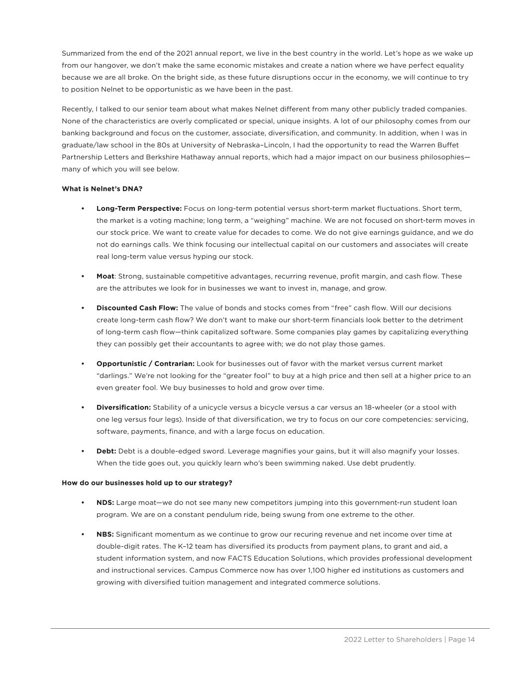 2022 Letter to Shareholders | Page 14 Summarized from the end of the 2021 annual report, we live in the best country in the world. Let’s hope as we wake up from our hangover, we don’t make the same economic mistakes and create a nation where we have perfect equality because we are all broke. On the bright side, as these future disruptions occur in the economy, we will continue to try to position Nelnet to be opportunistic as we have been in the past. Recently, I talked to our senior team about what makes Nelnet different from many other publicly traded companies. None of the characteristics are overly complicated or special, unique insights. A lot of our philosophy comes from our banking background and focus on the customer, associate, diversification, and community. In addition, when I was in graduate/law school in the 80s at University of Nebraska–Lincoln, I had the opportunity to read the Warren Buffet Partnership Letters and Berkshire Hathaway annual reports, which had a major impact on our business philosophies— many of which you will see below. What is Nelnet’s DNA? • Long-Term Perspective: Focus on long-term potential versus short-term market fluctuations. Short term, the market is a voting machine; long term, a “weighing” machine. We are not focused on short-term moves in our stock price. We want to create value for decades to come. We do not give earnings guidance, and we do not do earnings calls. We think focusing our intellectual capital on our customers and associates will create real long-term value versus hyping our stock. • Moat: Strong, sustainable competitive advantages, recurring revenue, profit margin, and cash flow. These are the attributes we look for in businesses we want to invest in, manage, and grow. • Discounted Cash Flow: The value of bonds and stocks comes from “free” cash flow. Will our decisions create long-term cash flow? We don’t want to make our short-term financials look better to the detriment of long-term cash flow—think capitalized software. Some companies play games by capitalizing everything they can possibly get their accountants to agree with; we do not play those games. • Opportunistic / Contrarian: Look for businesses out of favor with the market versus current market “darlings.” We’re not looking for the “greater fool” to buy at a high price and then sell at a higher price to an even greater fool. We buy businesses to hold and grow over time. • Diversification: Stability of a unicycle versus a bicycle versus a car versus an 18-wheeler (or a stool with one leg versus four legs). Inside of that diversification, we try to focus on our core competencies: servicing, software, payments, finance, and with a large focus on education. • Debt: Debt is a double-edged sword. Leverage magnifies your gains, but it will also magnify your losses. When the tide goes out, you quickly learn who’s been swimming naked. Use debt prudently. How do our businesses hold up to our strategy? • NDS: Large moat—we do not see many new competitors jumping into this government-run student loan program. We are on a constant pendulum ride, being swung from one extreme to the other. • NBS: Significant momentum as we continue to grow our recuring revenue and net income over time at double-digit rates. The K–12 team has diversified its products from payment plans, to grant and aid, a student information system, and now FACTS Education Solutions, which provides professional development and instructional services. Campus Commerce now has over 1,100 higher ed institutions as customers and growing with diversified tuition management and integrated commerce solutions.