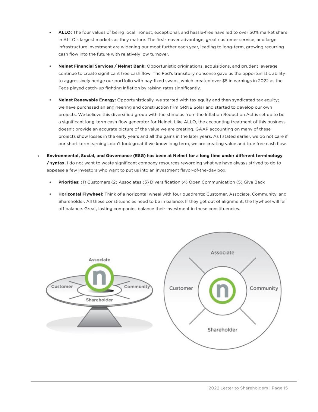 2022 Letter to Shareholders | Page 15 • ALLO: The four values of being local, honest, exceptional, and hassle-free have led to over 50% market share in ALLO's largest markets as they mature. The first-mover advantage, great customer service, and large infrastructure investment are widening our moat further each year, leading to long-term, growing recurring cash flow into the future with relatively low turnover. • Nelnet Financial Services / Nelnet Bank: Opportunistic originations, acquisitions, and prudent leverage continue to create significant free cash flow. The Fed’s transitory nonsense gave us the opportunistic ability to aggressively hedge our portfolio with pay-fixed swaps, which created over $5 in earnings in 2022 as the Feds played catch-up fighting inflation by raising rates significantly. • Nelnet Renewable Energy: Opportunistically, we started with tax equity and then syndicated tax equity; we have purchased an engineering and construction firm GRNE Solar and started to develop our own projects. We believe this diversified group with the stimulus from the Inflation Reduction Act is set up to be a significant long-term cash flow generator for Nelnet. Like ALLO, the accounting treatment of this business doesn’t provide an accurate picture of the value we are creating. GAAP accounting on many of these projects show losses in the early years and all the gains in the later years. As I stated earlier, we do not care if our short-term earnings don’t look great if we know long term, we are creating value and true free cash flow. » Environmental, Social, and Governance (ESG) has been at Nelnet for a long time under different terminology / syntax. I do not want to waste significant company resources rewording what we have always strived to do to appease a few investors who want to put us into an investment flavor-of-the-day box. • Priorities: (1) Customers (2) Associates (3) Diversification (4) Open Communication (5) Give Back • Horizontal Flywheel: Think of a horizontal wheel with four quadrants: Customer, Associate, Community, and Shareholder. All these constituencies need to be in balance. If they get out of alignment, the flywheel will fall off balance. Great, lasting companies balance their investment in these constituencies.